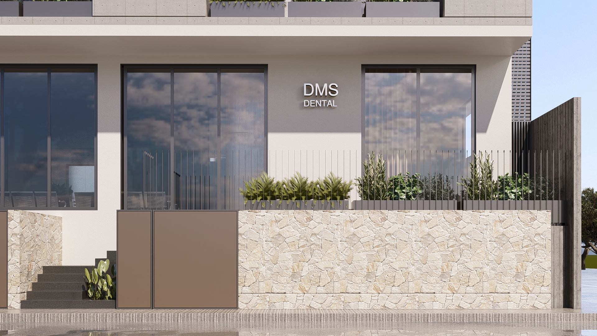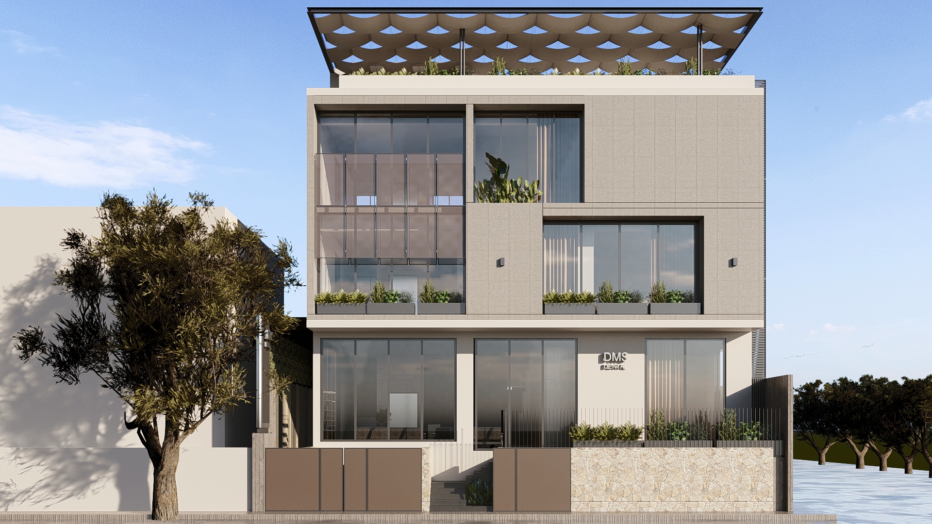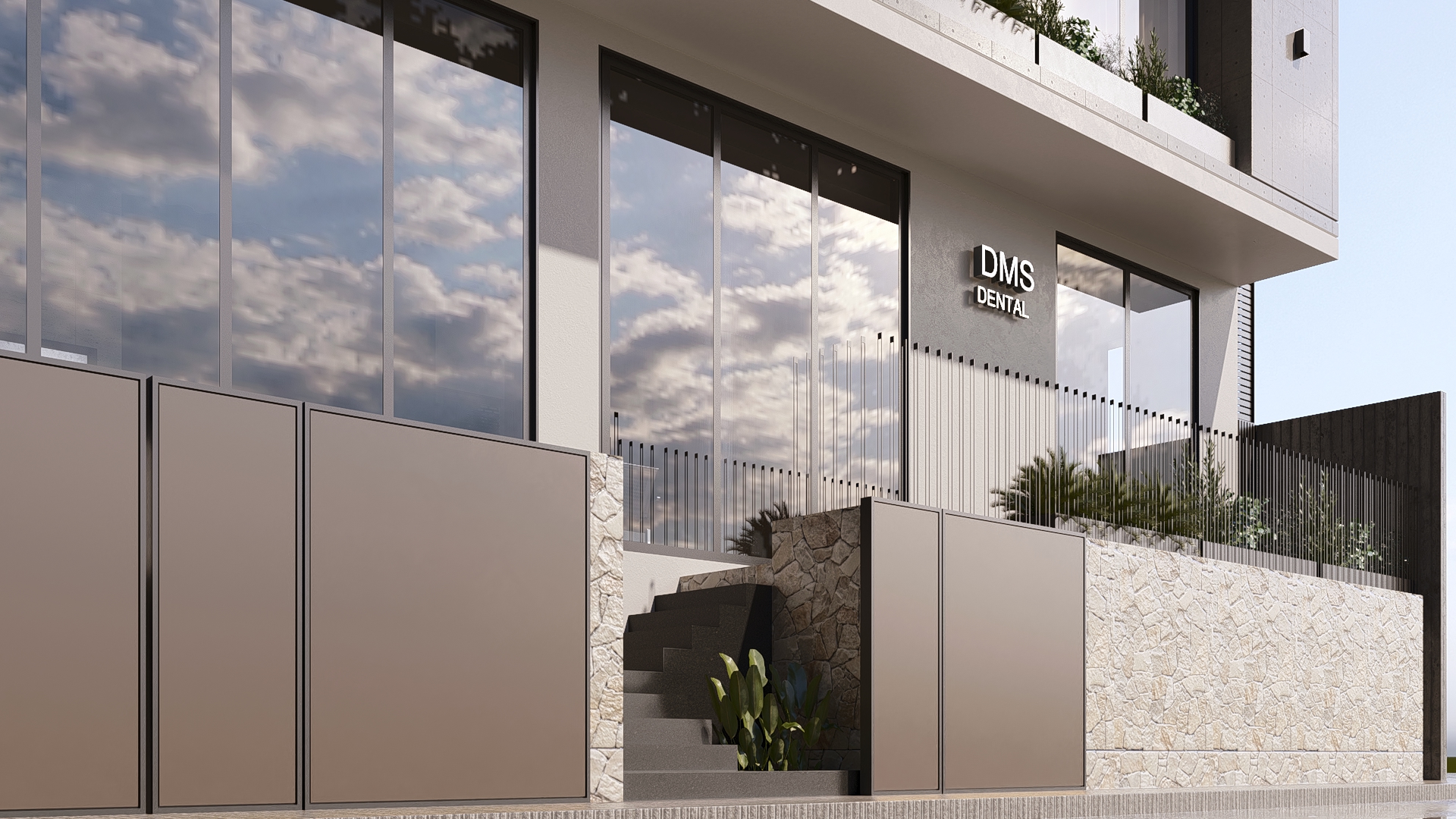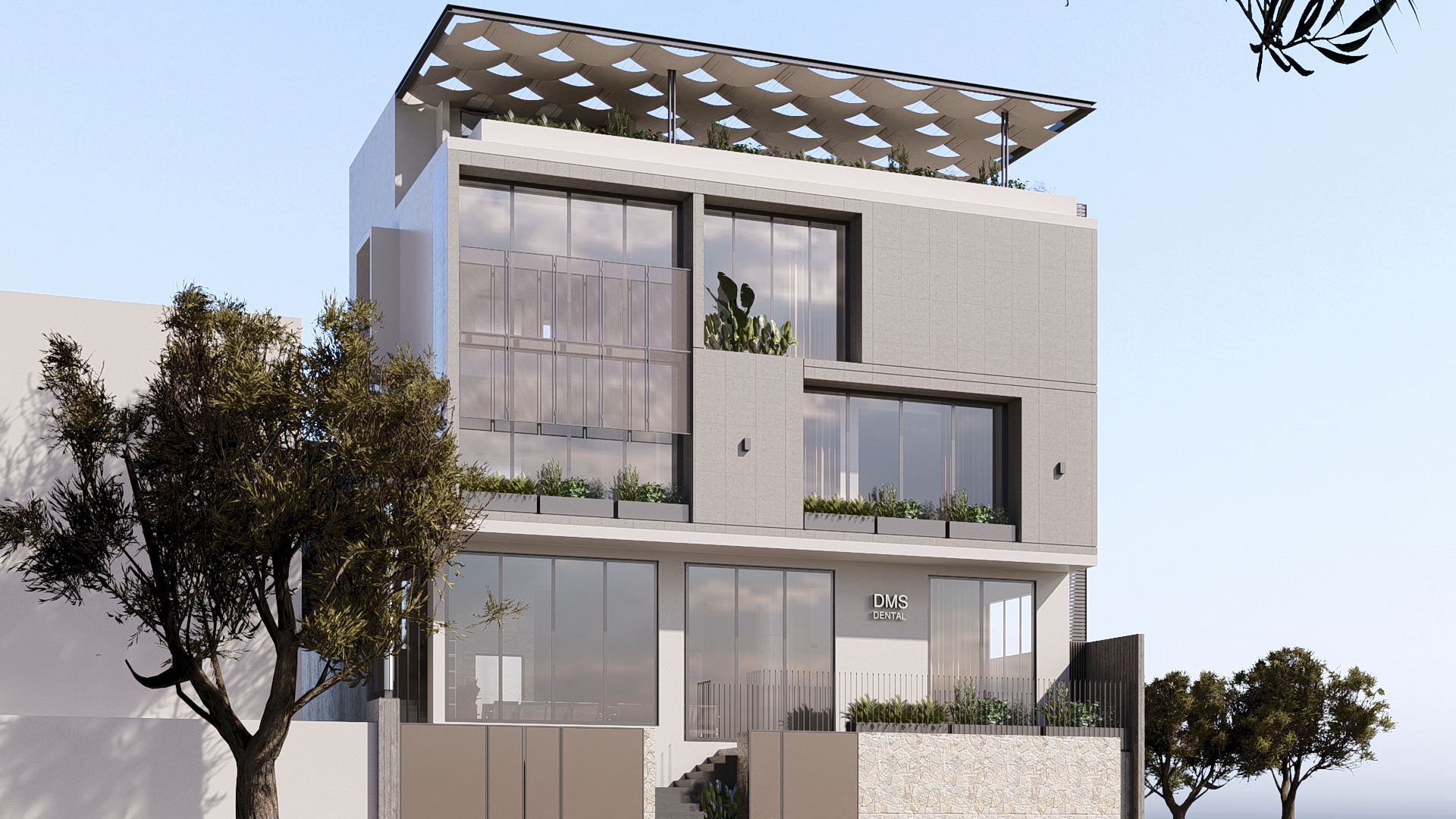 Rising with quiet confidence along the street, the building presents a modern, sculpted façade that balances precision with warmth. Its composition is defined by clean rectilinear volumes, layered thoughtfully to create depth while maintaining a restrained elegance. The exterior palette—soft beige cladding, muted stonework, and bronze-toned accents—establishes a calm, refined identity that aligns naturally with its function as a healthcare environment. Large, uninterrupted glazing on the ground floor invites natural light deep into the interior, suggesting transparency and openness. Subtle vertical fins and sheer panels above modulate sunlight while adding a delicate rhythm to the elevation. Planters integrated along the balconies infuse the rigid geometry with greenery, softening the form and creating a connection between inside and out. The upper level is crowned with a striking perforated canopy, its sculptural pattern casting shifting shadows that animate the terrace throughout the day. This rooftop element not only adds architectural drama but also frames the building against the sky, giving it a distinct signature. Overall, the architecture communicates clarity and care—an environment designed to put visitors at ease. Through material harmony, disciplined geometry, and an emphasis on light, the building stands as a contemporary, welcoming expression of a modern dental facility.