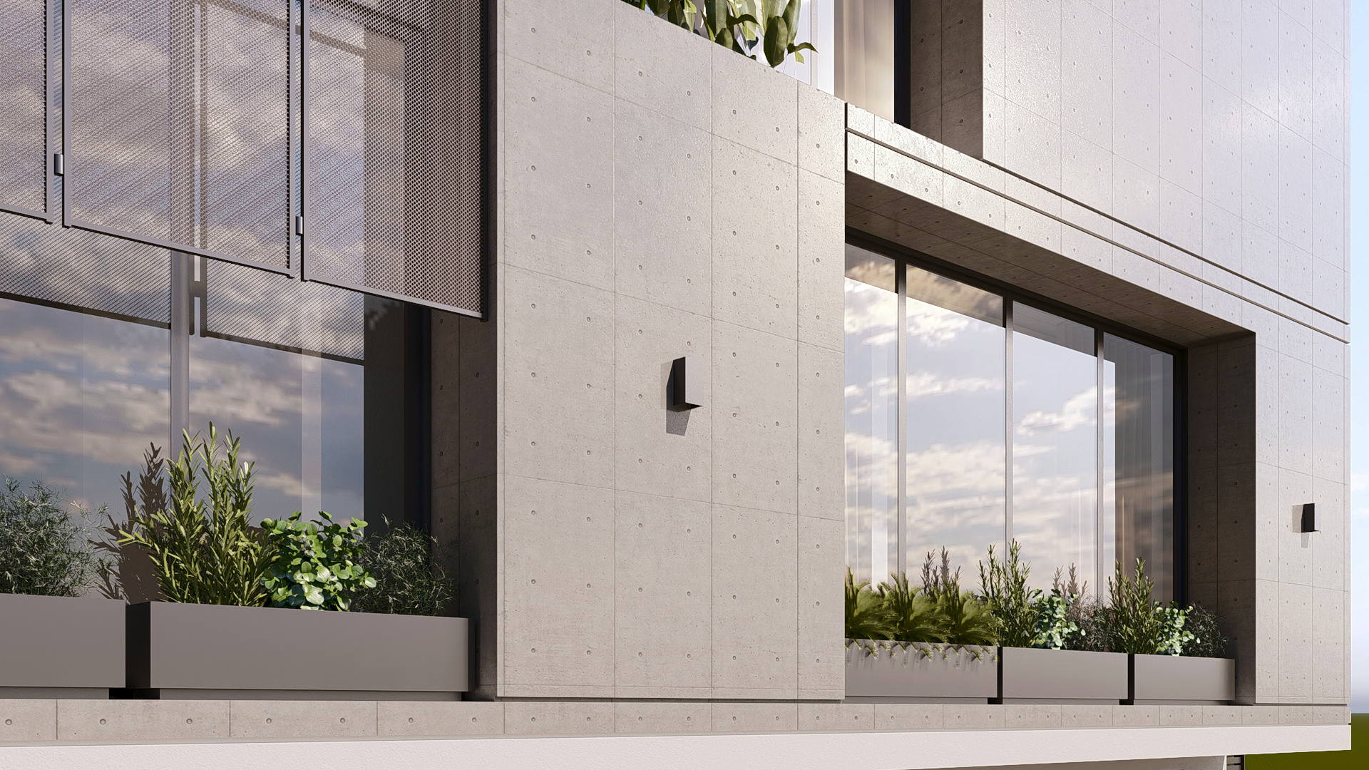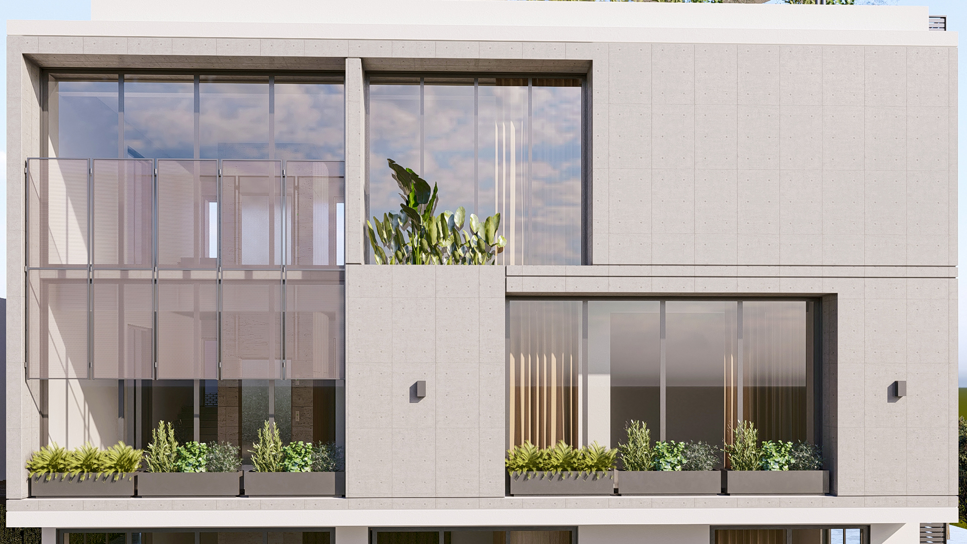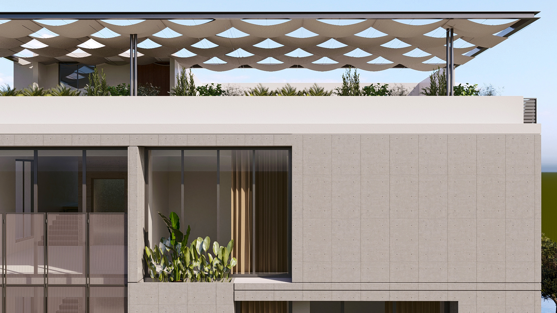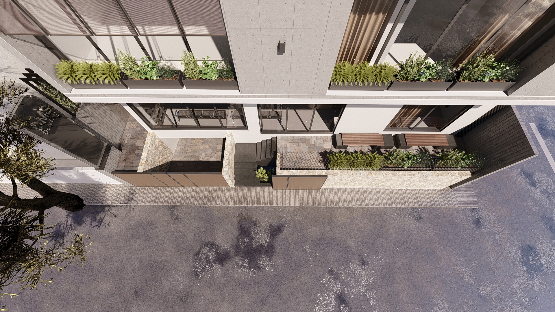 Rising with quiet confidence along the street, the building presents a modern, sculpted façade that balances precision with warmth. Its composition is defined by clean rectilinear volumes, layered thoughtfully to create depth while maintaining a restrained elegance. The exterior palette—soft beige cladding, muted stonework, and bronze-toned accents—establishes a calm, refined identity that aligns naturally with its function as a healthcare environment. Large, uninterrupted glazing on the ground floor invites natural light deep into the interior, suggesting transparency and openness. Subtle vertical fins and sheer panels above modulate sunlight while adding a delicate rhythm to the elevation. Planters integrated along the balconies infuse the rigid geometry with greenery, softening the form and creating a connection between inside and out. The upper level is crowned with a striking perforated canopy, its sculptural pattern casting shifting shadows that animate the terrace throughout the day. This rooftop element not only adds architectural drama but also frames the building against the sky, giving it a distinct signature. Overall, the architecture communicates clarity and care—an environment designed to put visitors at ease. Through material harmony, disciplined geometry, and an emphasis on light, the building stands as a contemporary, welcoming expression of a modern dental facility.