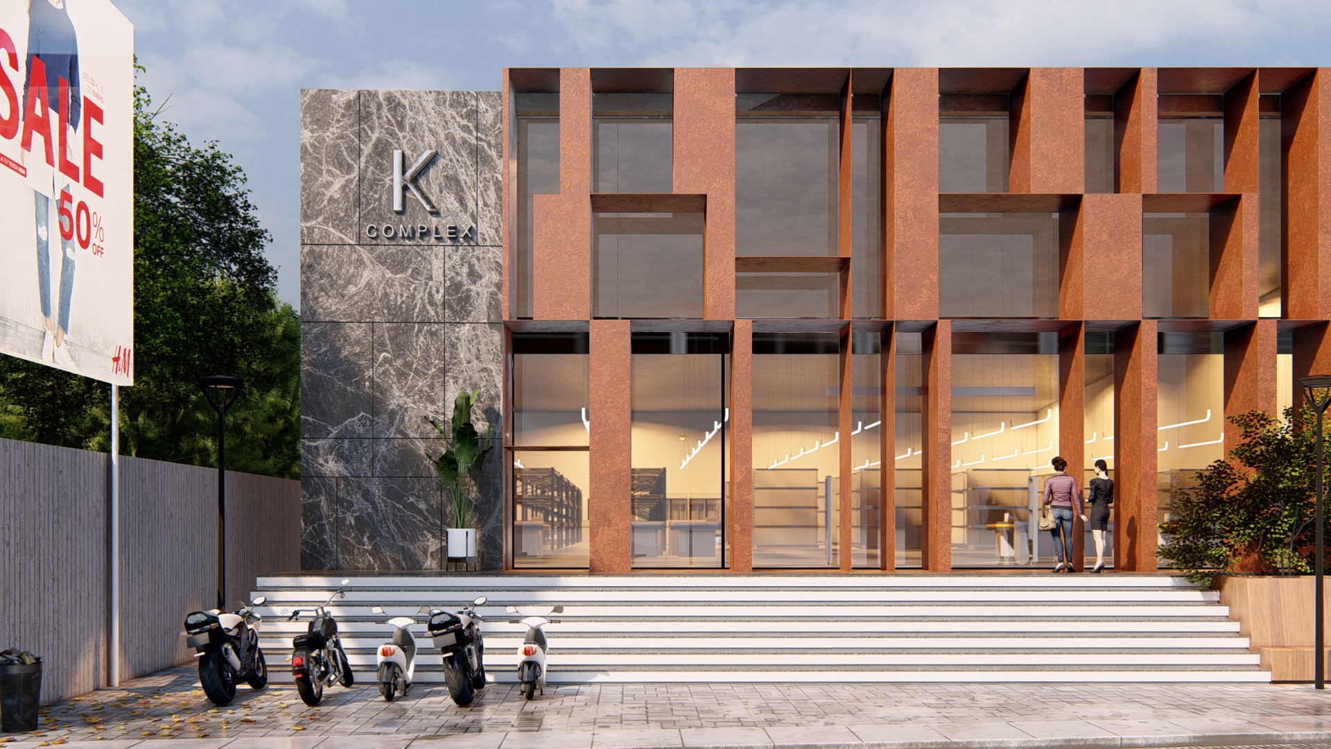 K Complex presents a confident contemporary identity, defined by the harmonious interplay of corten steel and granite—two materials that contrast in texture yet complement one another with striking sophistication. The façade’s rhythmic vertical expression creates depth and shadow, while expansive glazing introduces lightness and transparency, allowing the building to engage seamlessly with its urban context. The elevated entry sequence enhances the sense of arrival, framing the transition from public realm to interior space with subtle ceremony. Precise detailing, clean geometry, and a controlled, modern palette give the building a timeless clarity, positioning K Complex as a refined and enduring commercial landmark.