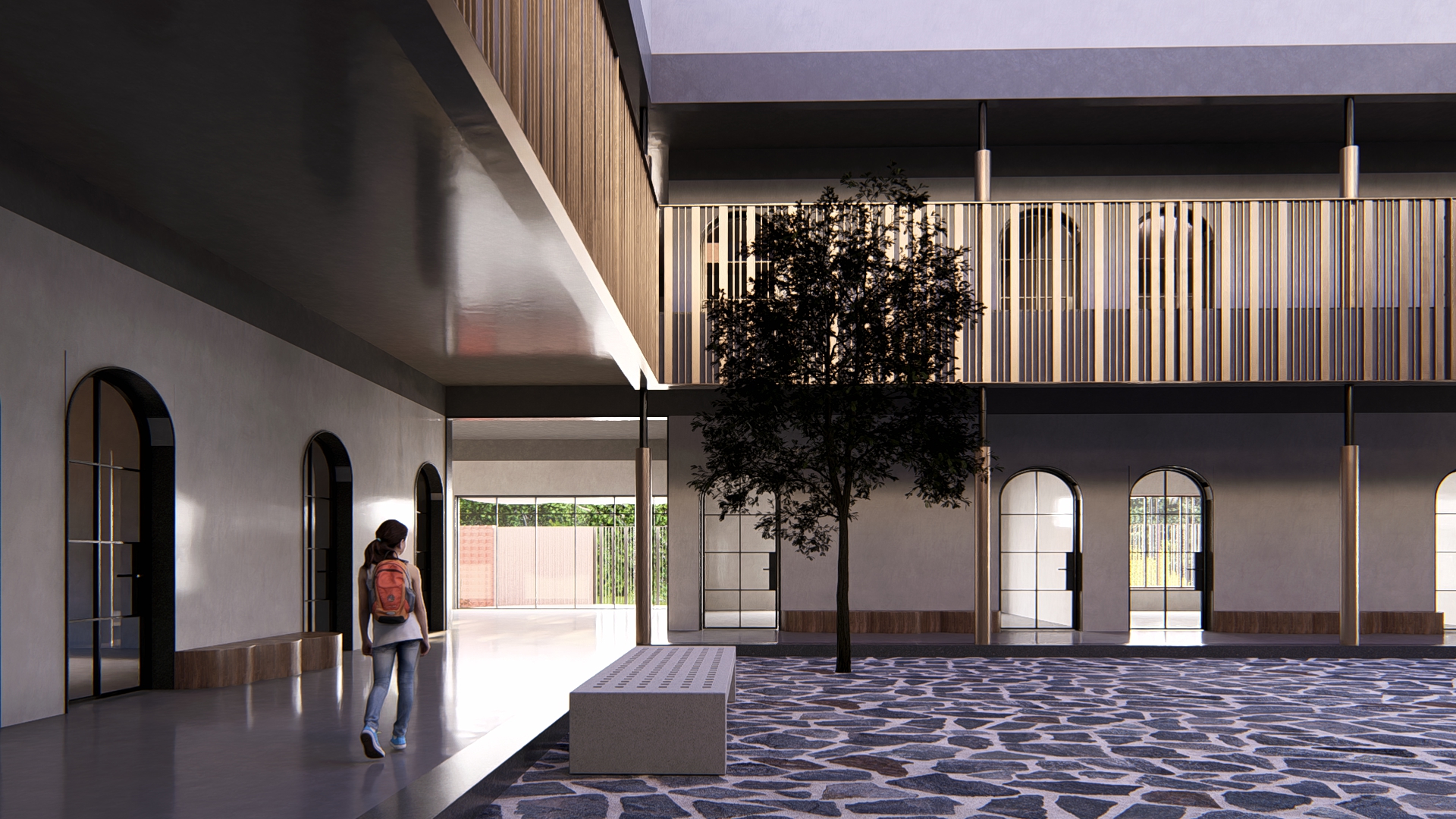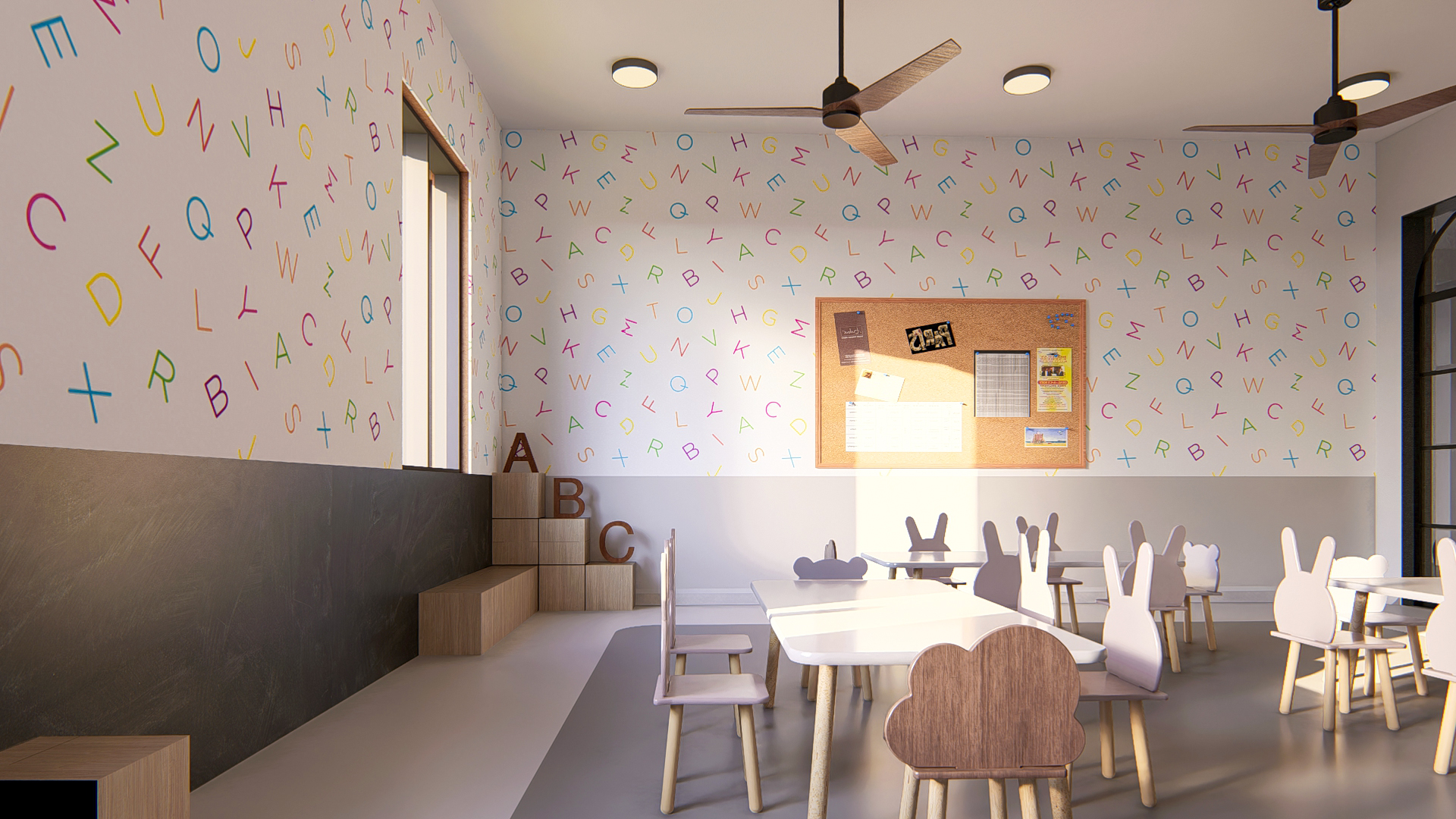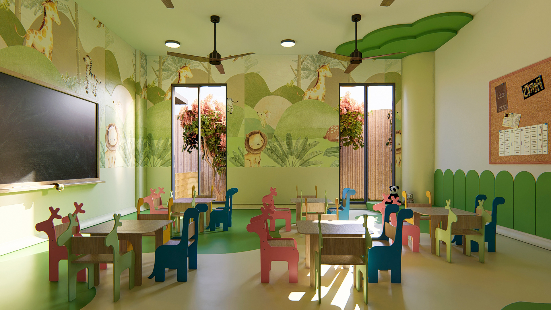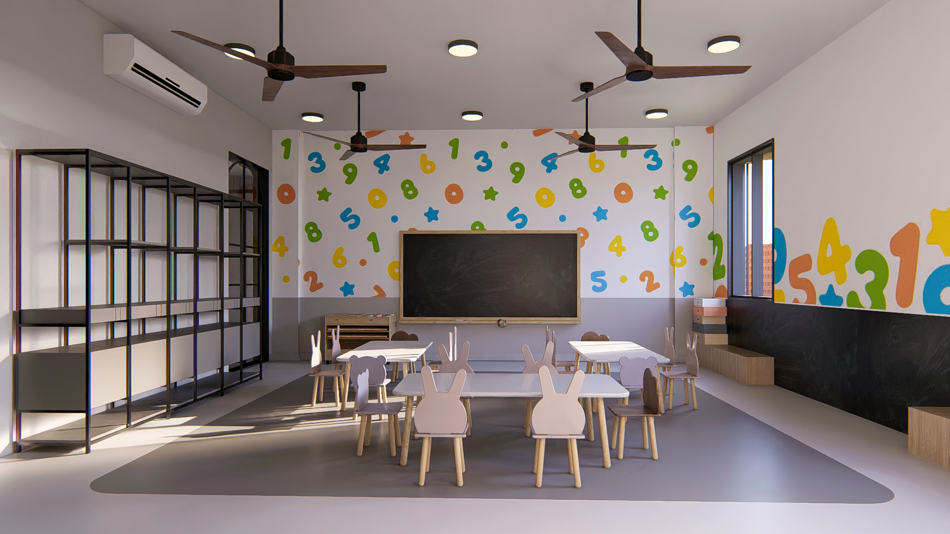 A World of Wonder Designed for Little Explorers Nestled in the vibrant community of Saravanampatti, Coimbatore, this 22,000 sq.ft pre-primary school is a celebration of playful architecture and child-centred learning. Every part of the campus is thoughtfully designed to spark curiosity, imagination, and joy—making the school itself a dynamic learning tool. The façade sets the tone with cloud-shaped window shades, a whimsical civil feature that instantly captures the spirit of childhood. These sculptural forms soften the building’s profile while offering functional shade, inviting children into a space where imagination is part of the everyday environment. Inside, lime-finished walls bring an earthy warmth, creating a calm and breathable atmosphere for young learners. The central courtyard—with its minimal steel railings—emphasizes openness, safety, and visual connectivity, encouraging free movement and effortless supervision. At the heart of the school’s philosophy lies its theme-based learning environments, each crafted to create immersive, hands-on educational experiences such as Mathematics, Phonics, Forest and Marine Environments. Together, these environments form a holistic learning ecosystem, enabling children to move seamlessly between cognitive, sensory, and imaginative experiences. Each space has been intentionally designed to support early development through play—ensuring that learning feels natural, meaningful, and fun. More than a school, this is a playful architectural landscape where children grow, explore, and dream.