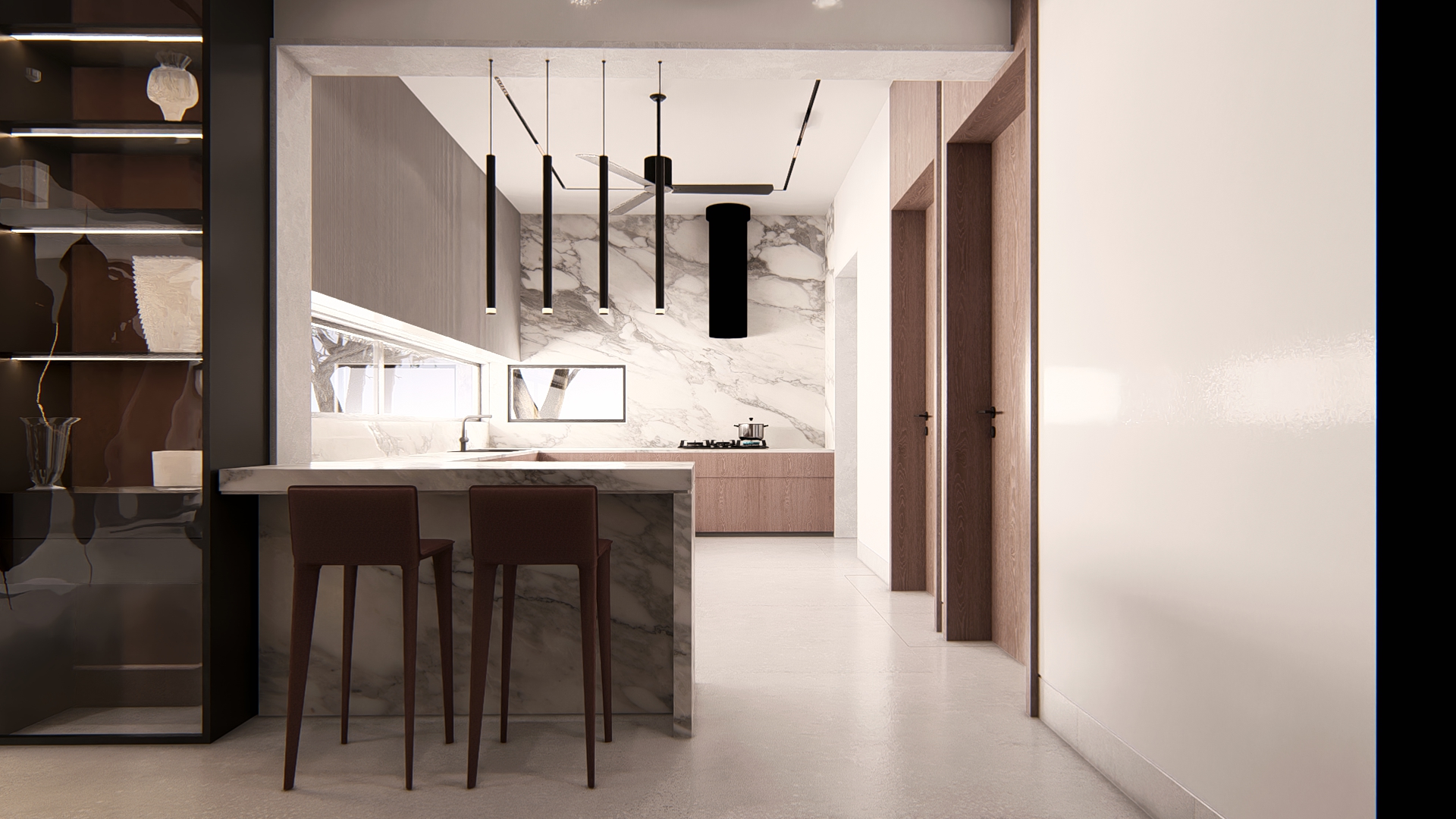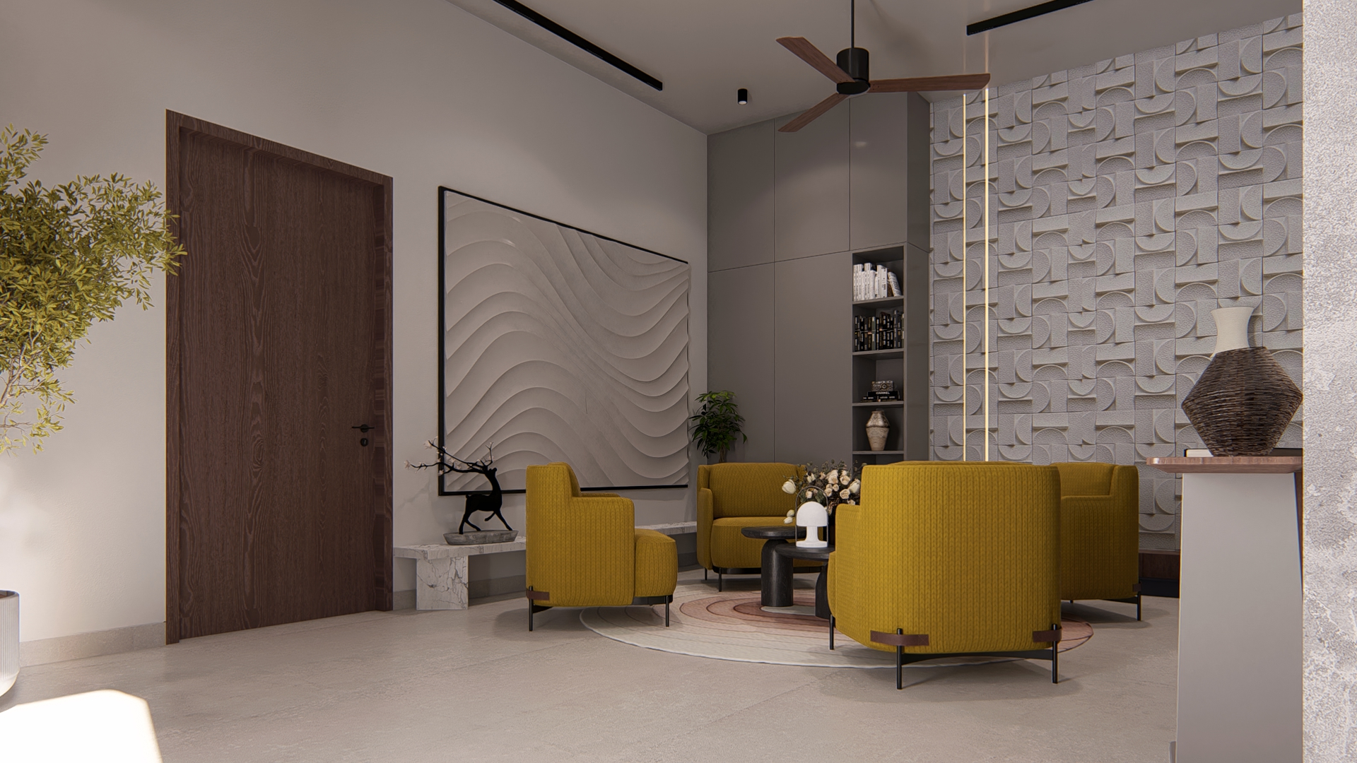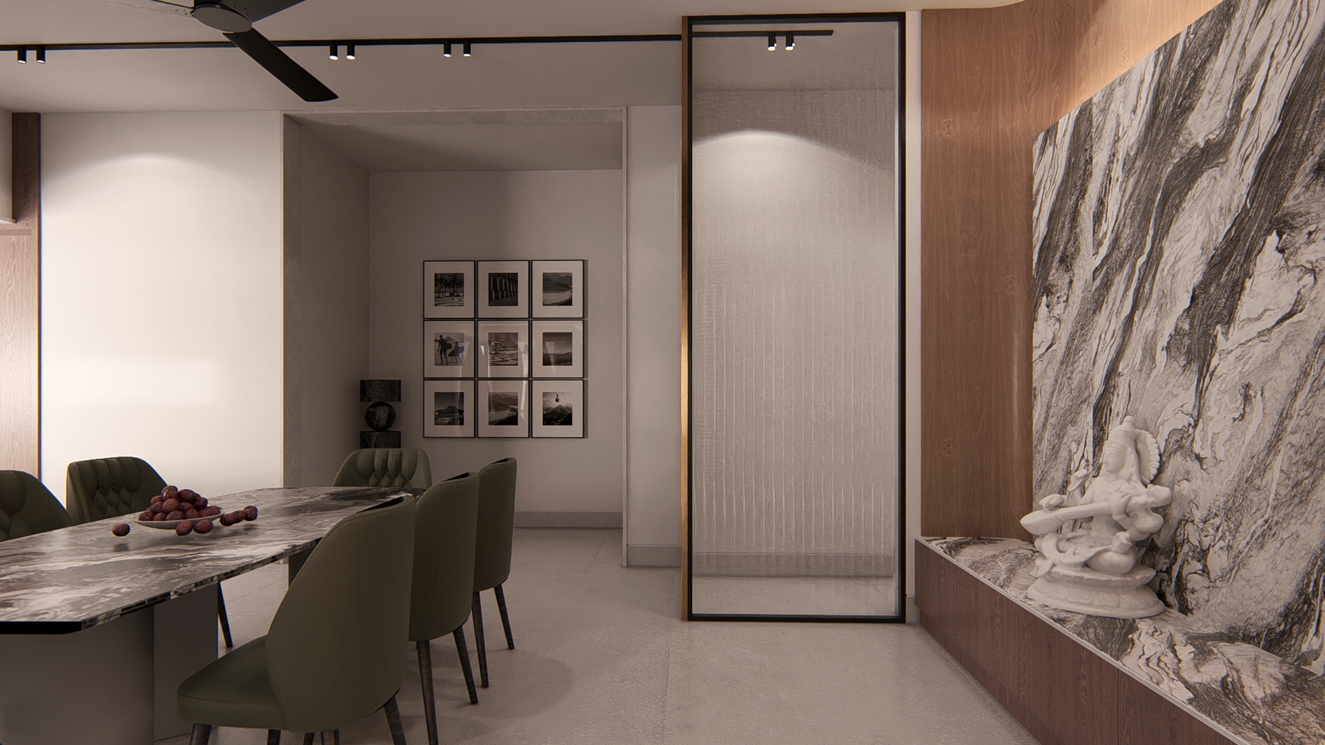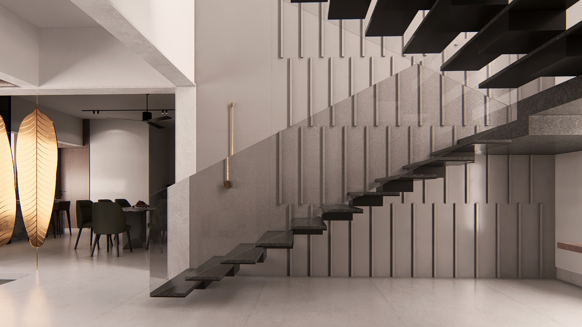Pietra is envisioned as a refined exploration of contemporary living, where sculptural forms and a rich vocabulary of stone textures come together to create an atmosphere of understated luxury. The residence unfolds through clean architectural lines softened by warm light that plays across travertine planes, ribbed timber panels, and expressive marble surfaces—each material chosen to honor the tactile beauty implied in its name. Every space is choreographed as a distinct experience: floating stone stair treads that evoke lightness, a meditative pooja alcove wrapped in warm wood and veined stone, a kitchen shaped by monolithic marble geometry, and a living area that balances curated restraint with crafted detail. Rooted in global modernism yet intimately personal, Pietra embodies a calm, thoughtful, and elevated design ethos—where craftsmanship, material honesty, and contemporary sensibility come together in harmonious balance.