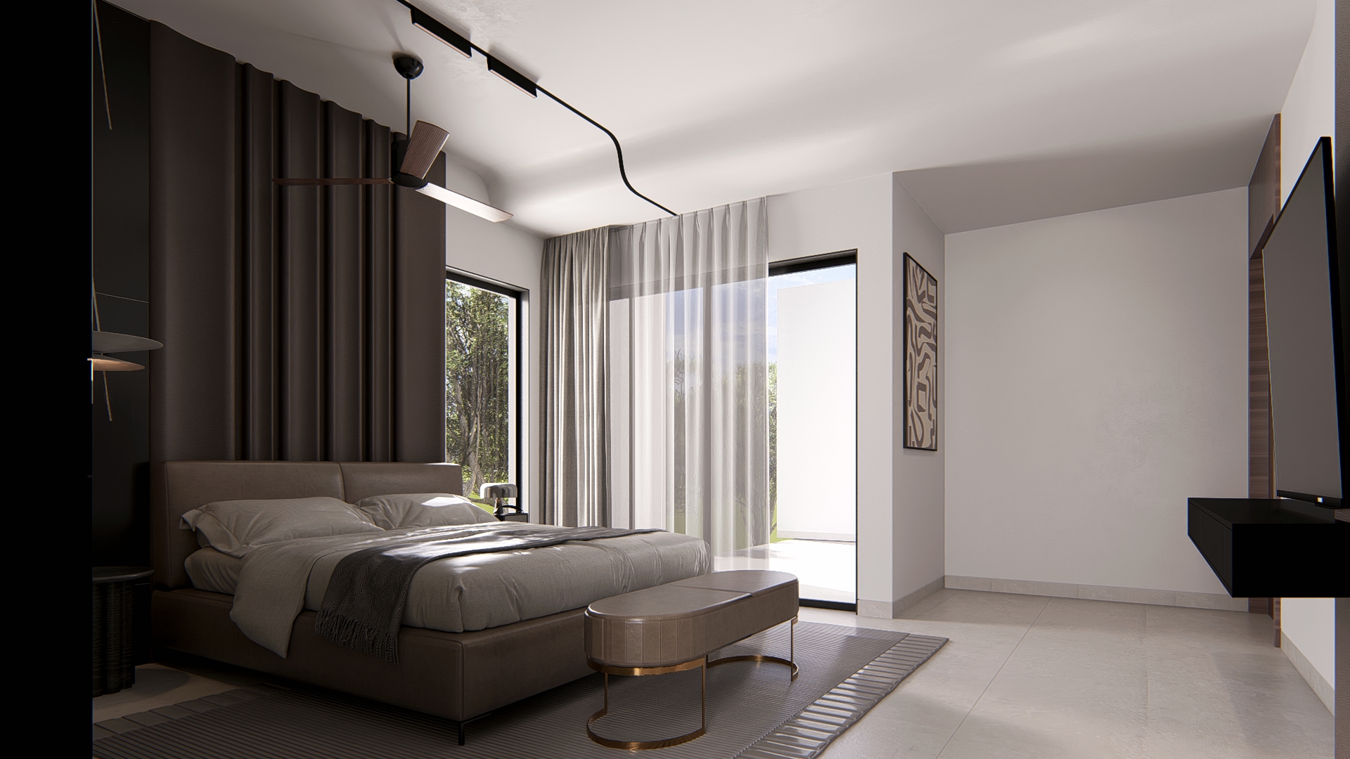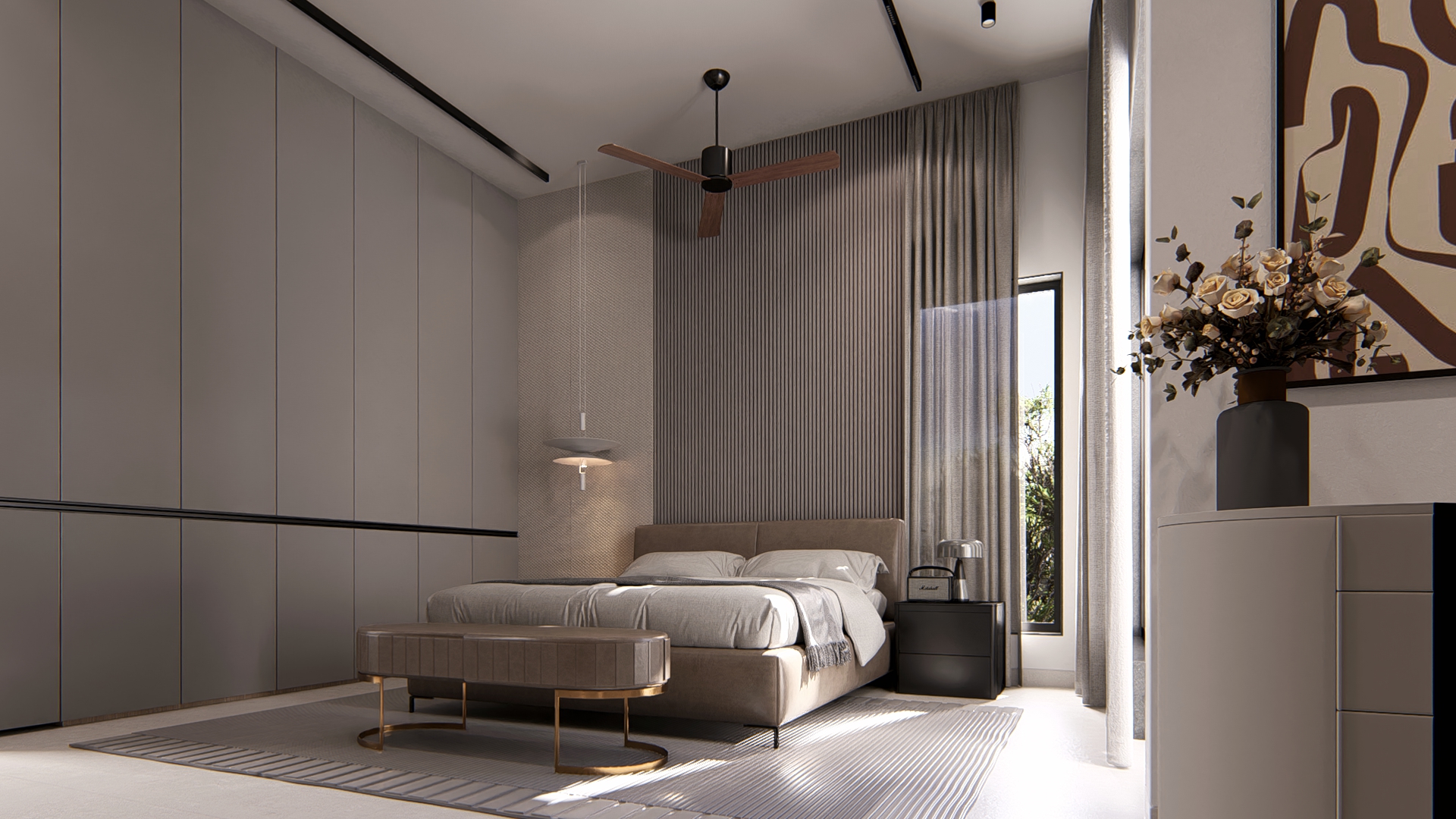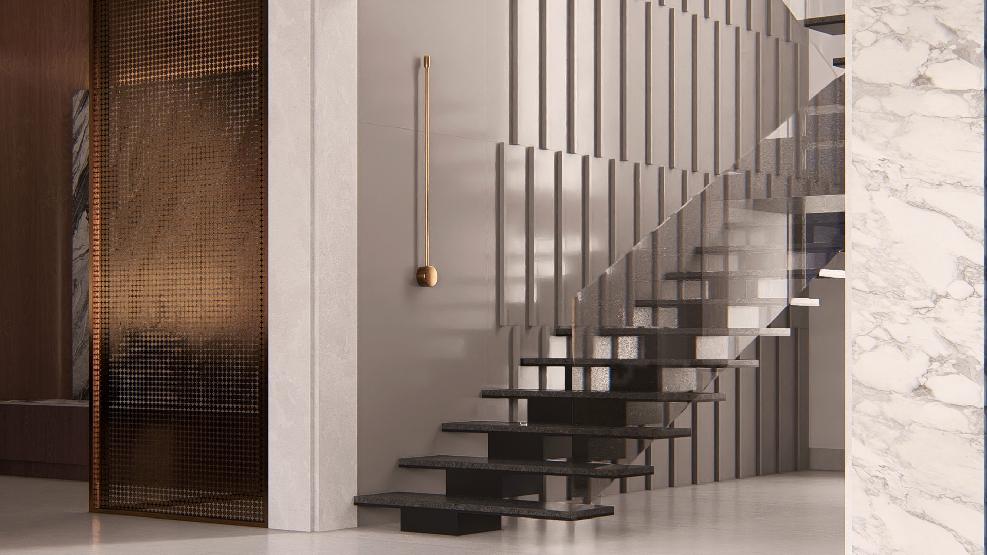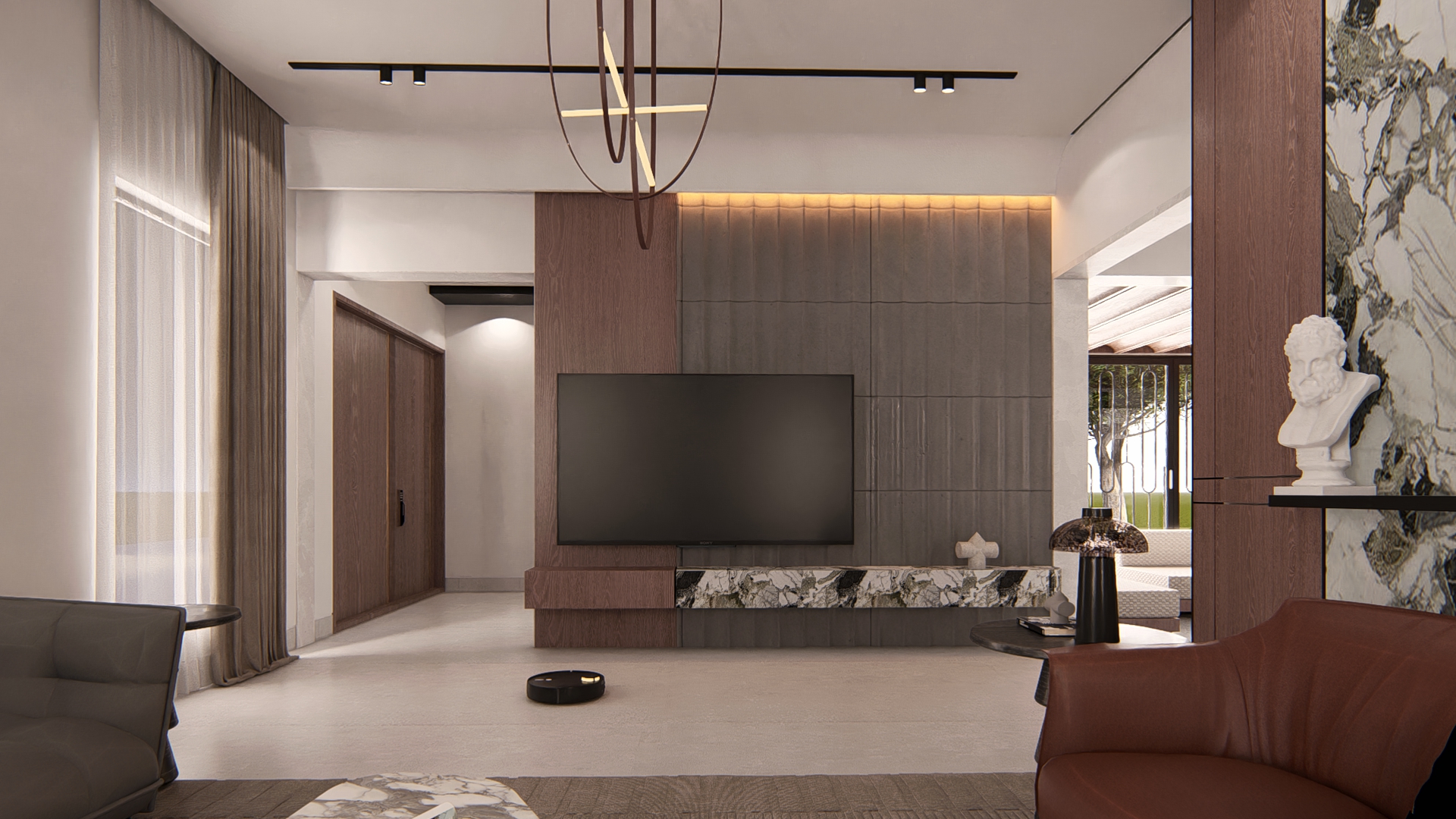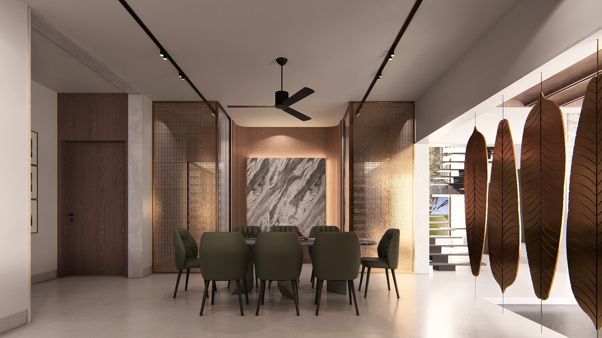 Pietra is envisioned as a refined exploration of contemporary living, where sculptural forms and a rich vocabulary of stone textures come together to create an atmosphere of understated luxury. The residence unfolds through clean architectural lines softened by warm light that plays across travertine planes, ribbed timber panels, and expressive marble surfaces—each material chosen to honor the tactile beauty implied in its name. Every space is choreographed as a distinct experience: floating stone stair treads that evoke lightness, a meditative pooja alcove wrapped in warm wood and veined stone, a kitchen shaped by monolithic marble geometry, and a living area that balances curated restraint with crafted detail. Rooted in global modernism yet intimately personal, Pietra embodies a calm, thoughtful, and elevated design ethos—where craftsmanship, material honesty, and contemporary sensibility come together in harmonious balance.