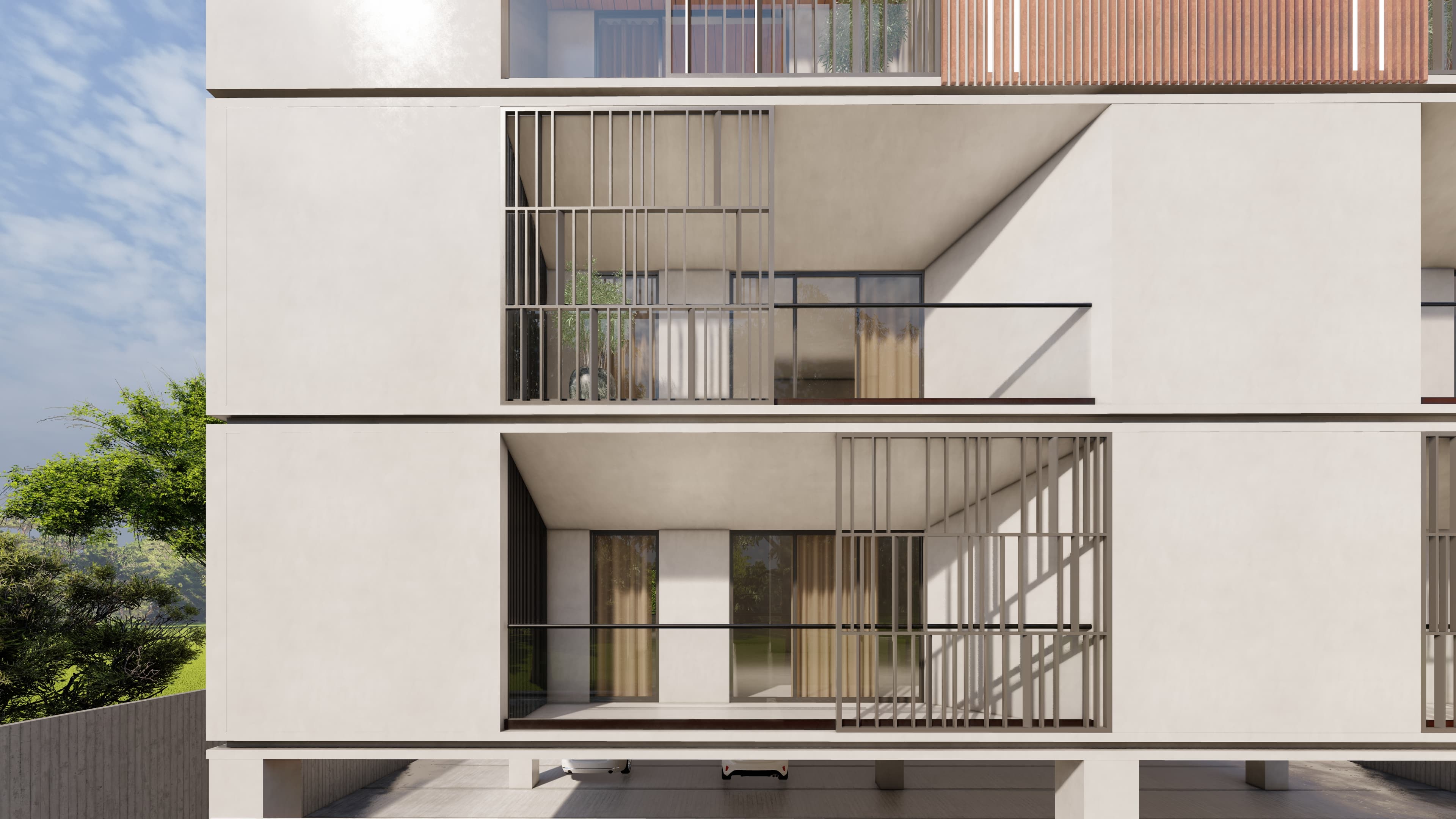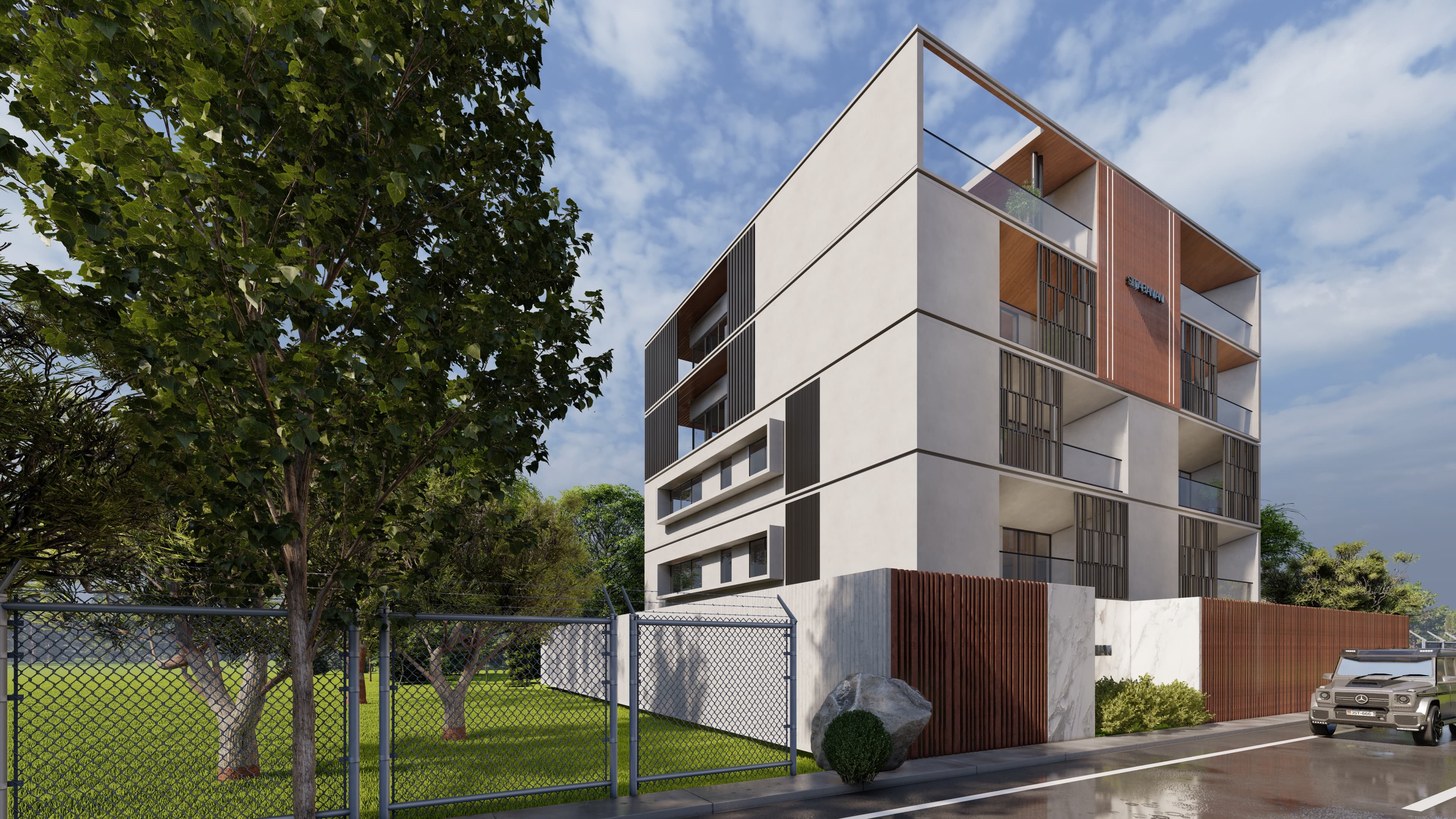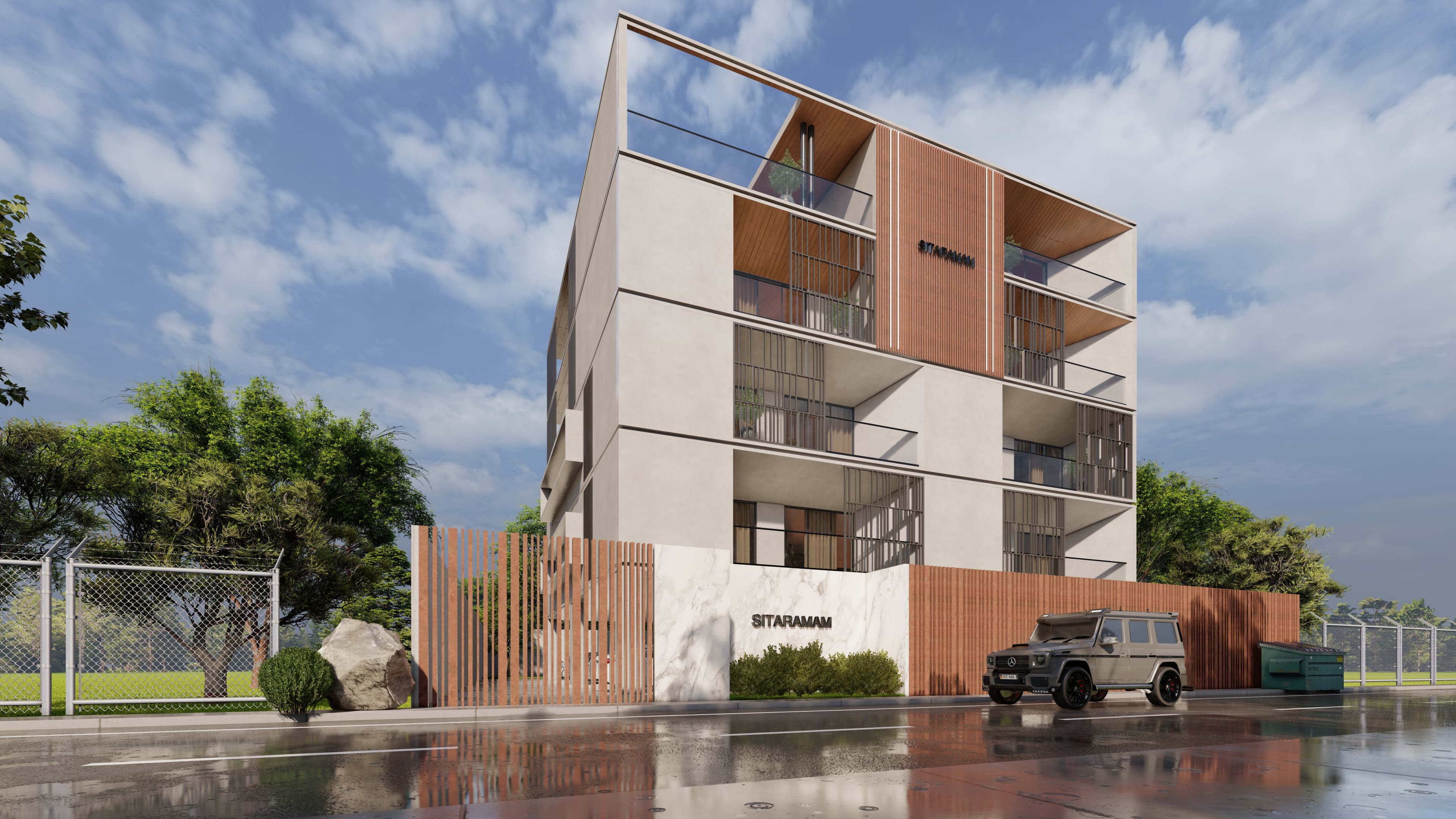 Set within the calm outskirts of Erode, Sitaramam is envisioned as a refined residential development that harmonizes modern architecture with serene living. Designed for families seeking space, light, and a heightened quality of life, the project features thoughtfully planned premium units that celebrate openness and connection to nature. The building’s architectural identity is defined by its rhythmic façade of clean lines, layered planes, and spacious balconies that sculpt a distinctive visual language. Warm wooden textures and linear metal screens introduce depth and texture, creating a contemporary yet grounded aesthetic. The exterior composition balances privacy and transparency—offering residents abundant natural light and unobstructed views while maintaining an elegant, uniform expression. At the crown of the structure sits the bespoke penthouse, a sculptural haven crafted with elevated sensibilities. The entrance opens into a dramatic central courtyard, framed in glass and enlivened with sculpted greenery—blurring the lines between indoors and outdoors. Adjacent lies a modern pooja space, designed with dignified simplicity and spiritual focus, anchoring the plan with a sense of calm. The expansive living and dining zones are oriented to capture panoramic views of the surrounding landscape, with interiors unfolding in luxurious monochrome palettes, rich natural stone, dark wood accents, and curated furniture pieces. Spatial continuity is enhanced through ceiling-height screens and seamless glazing, giving the home a feeling of quiet grandeur. Sitaramam redefines premium apartment living by integrating biophilic design, contemporary detailing, and generous spatial volumes, offering residents an elevated lifestyle rooted in comfort, design, and tranquility.