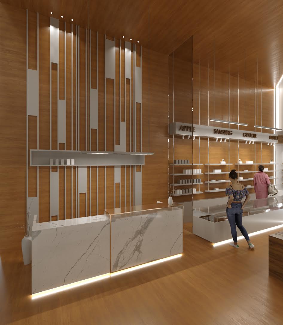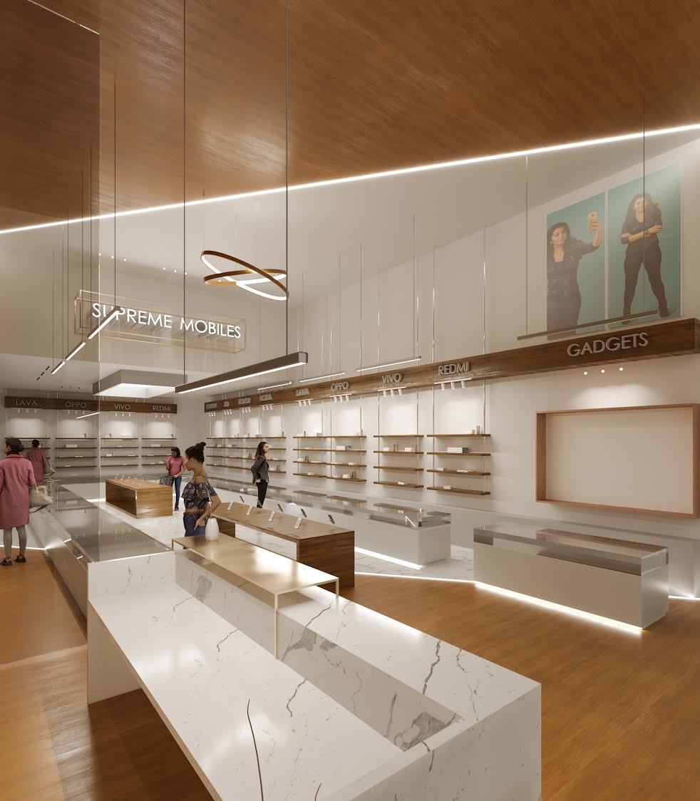 The interiors of Supreme Mobiles are designed to reflect clarity, structure, and modernity—bringing a refined corporate sensibility to the mobile retail environment. The space balances function and aesthetics, offering a clean, organized layout that makes browsing intuitive and effortless. A warm combination of wood finishes and crisp white surfaces establishes a welcoming yet professional atmosphere. Integrated LED lighting runs along the ceiling and floor planes, guiding movement naturally while highlighting key product zones. The central island forms the heart of the layout, designed for hands-on interaction and product exploration. Along the perimeter, brand-specific zones are clearly defined with linear display shelving and subtle backlit signage, ensuring effortless navigation and a clutter-free visual experience. The thoughtful spacing and layered display approach allow each product to stand out, enhancing visibility without overwhelming the user. A sculptural chandelier becomes a subtle design statement, adding softness and sophistication to an otherwise streamlined interior. The interplay of textures—wood, glass, and marble—creates a balanced rhythm that emphasizes both premium retail identity and operational efficiency. At Supreme Mobiles, the design goes beyond aesthetics. It creates a focused, seamless, and future-forward retail environment where customers can explore technology with clarity and confidence.