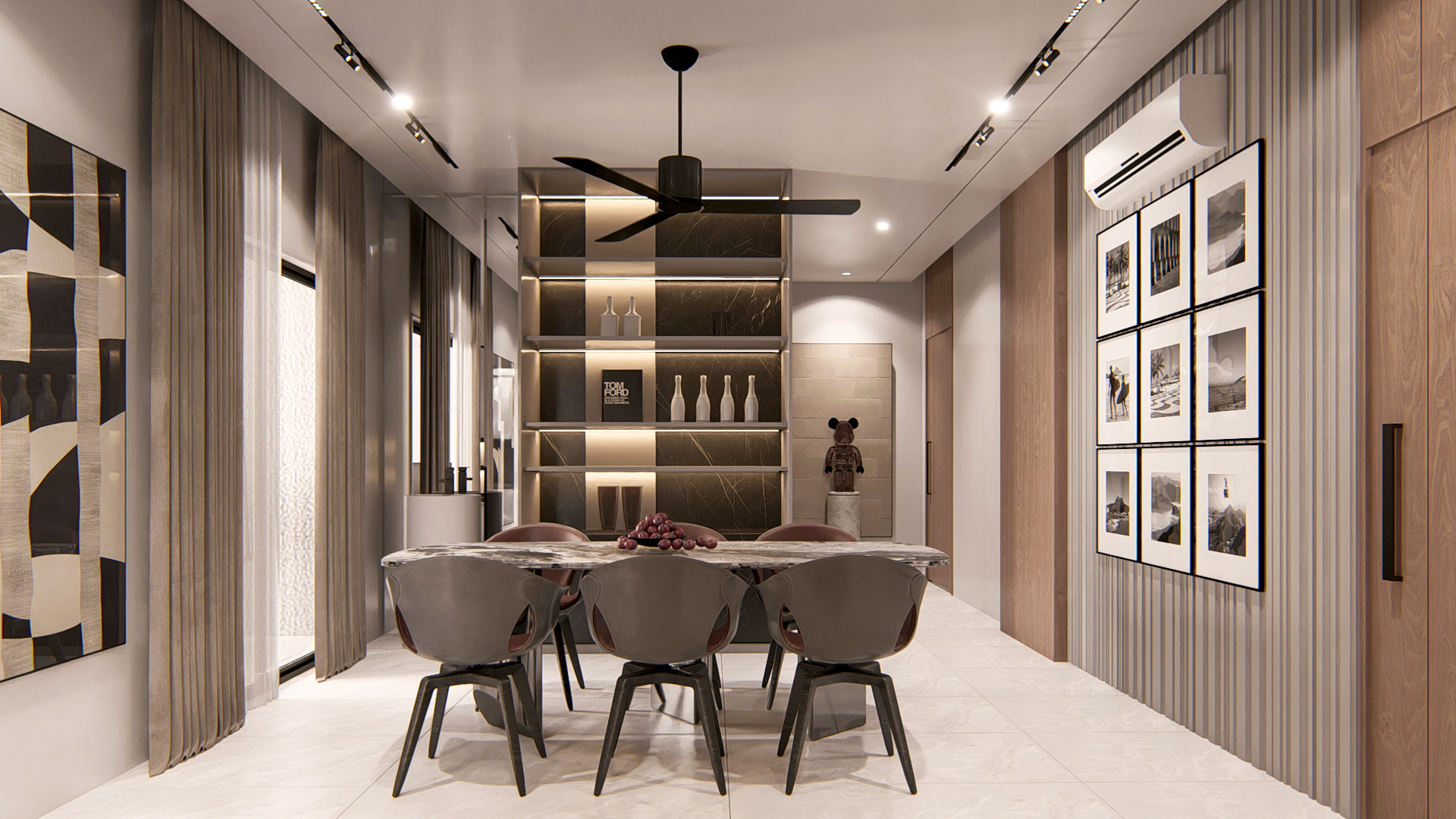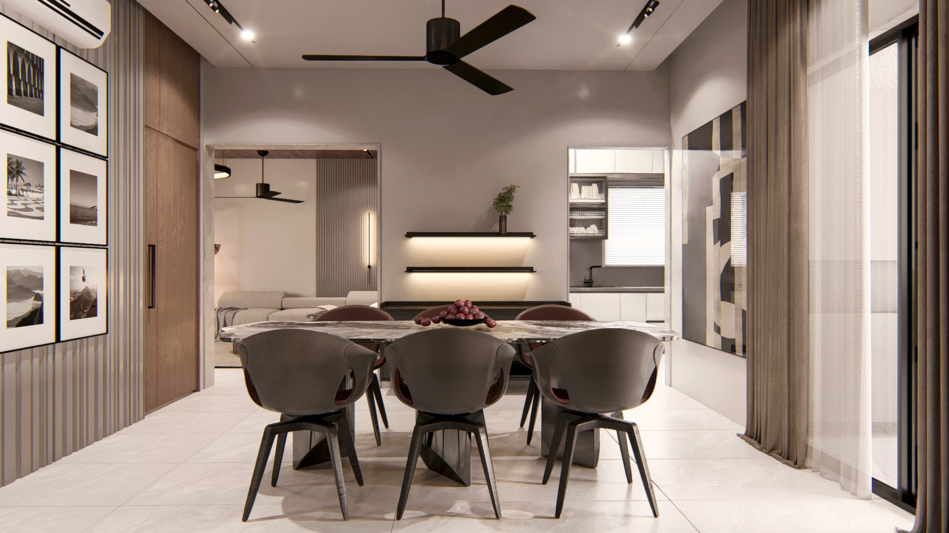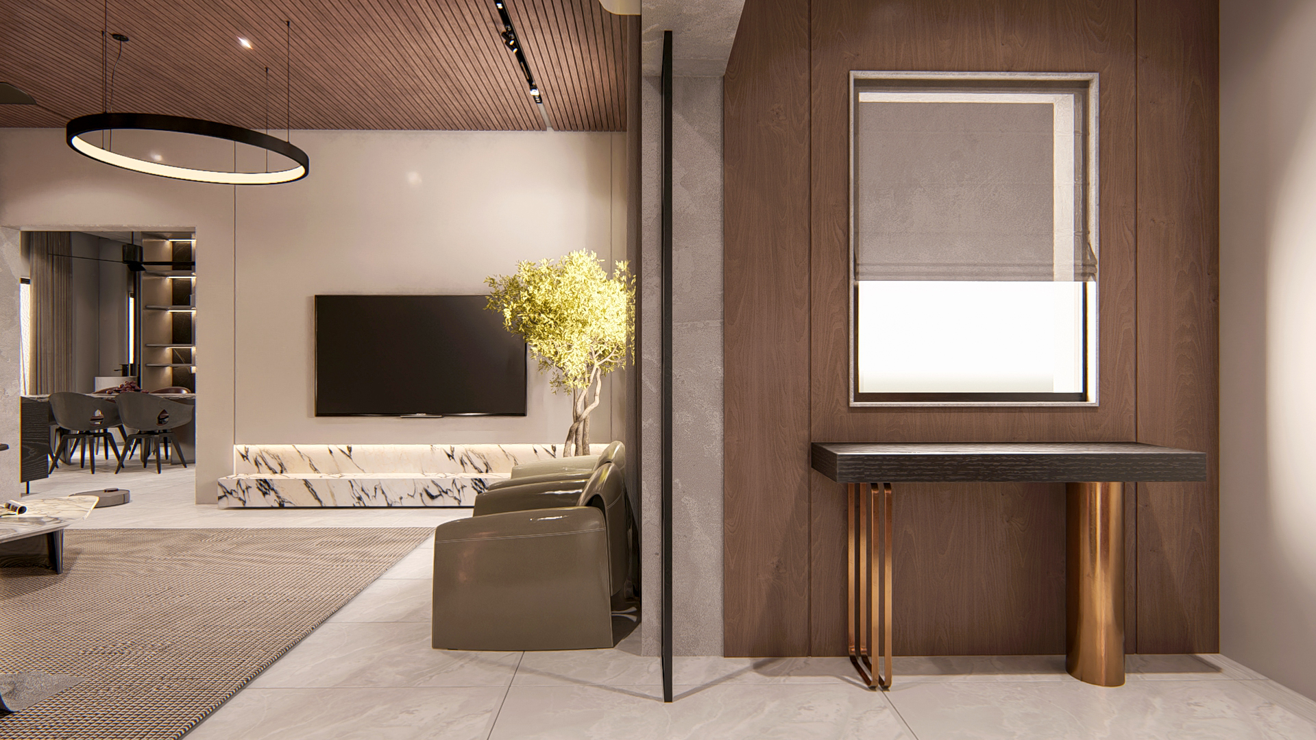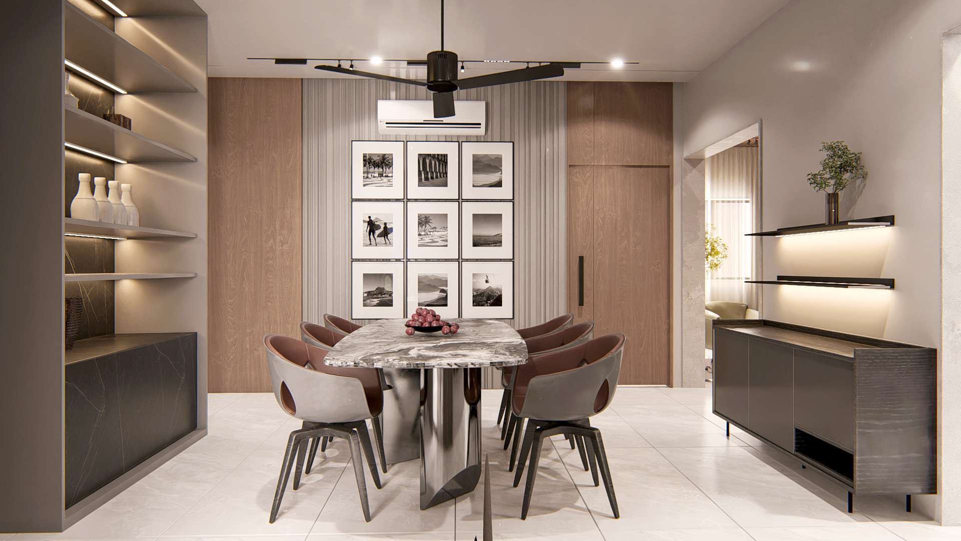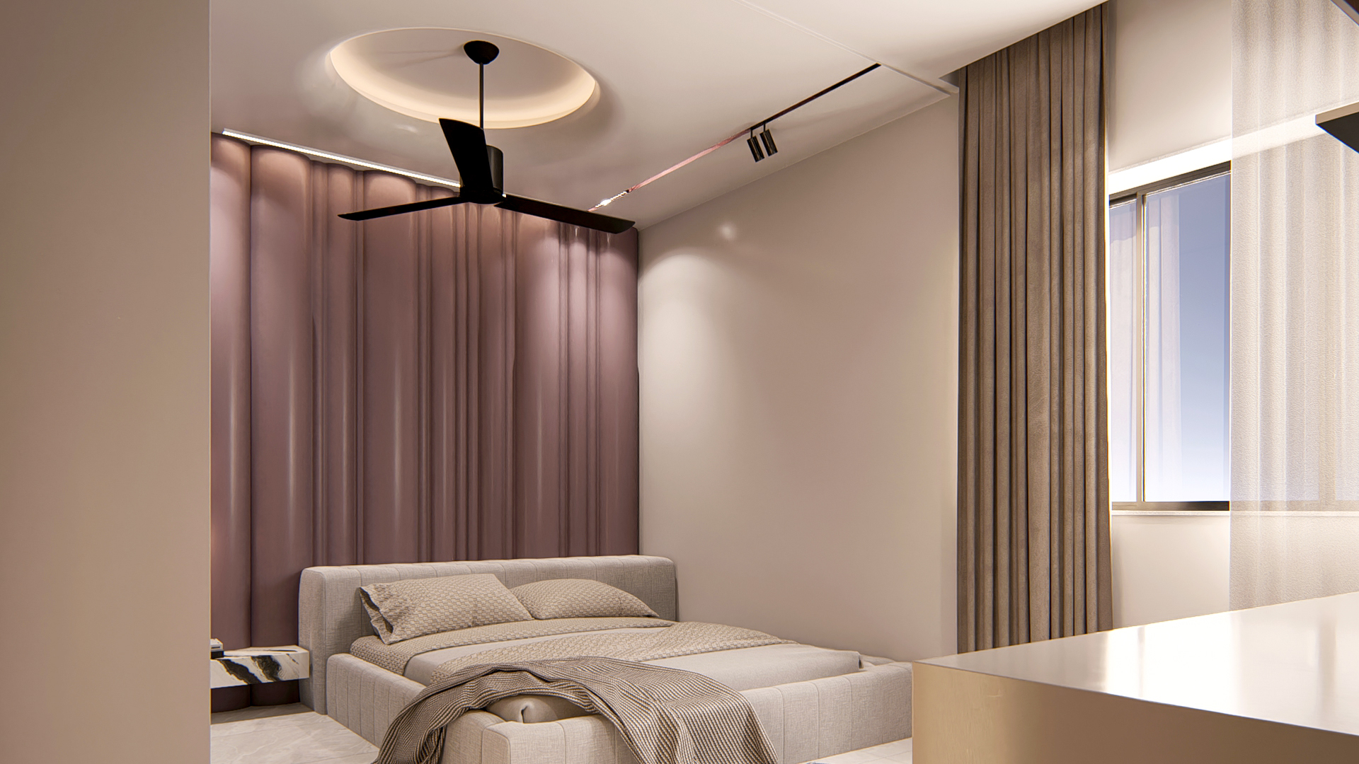 A Contemporary Haven of Luxury & Personal Expression Located on the top floor of a premium luxury apartment with panoramic views of the city, this residence is a sophisticated fusion of modern opulence and thoughtfully curated personal experiences. The material palette embraces pure luxury—a harmonious play of premium finishes, refined textures, and contemporary detailing that elevates everyday living into an immersive design experience. The spatial journey begins with a minimal and graceful foyer that opens into a vibrant, light-filled living hall. A striking Statuario marble platform forms the base of the TV unit, establishing an unmistakable statement of ultra-modern luxury. Every detail is executed with precision, including seamlessly concealed DB boards integrated into the wall paneling—maintaining aesthetic clarity without compromising functionality. The dining area continues the narrative of bold elegance with a beautifully crafted black-tinted glass crockery unit that becomes both a functional centrepiece and a sculptural visual highlight. Adjacent lies the guest bedroom, styled in a Neo-Classical language softened with delicate floral POP elements—merging vintage charm with contemporary refinement. The master bedroom unfolds as a generous sanctuary designed to breathe luxury, comfort, and convenience. Warm textures, layered lighting, and bespoke detailing transform it into a personal retreat that balances sophistication with serenity. Designed with a soft and youthful aesthetic, the daughter’s bedroom reflects tender personalisation. A gentle pink palette paired with playful wavy HDHMR elements shapes a charming space filled with personality and warmth—crafted as a reflection of her identity. The Pooja room serves as a vibrant spiritual core, reinterpreted through a modern lens. Clad in fluted marble with Statuario marble drawers, the space blends traditional sentiment with contemporary elegance, transforming devotion into a beautifully designed spatial experience. Together, the spaces form a cohesive narrative of refined living—where luxury meets meaningful design and where every corner celebrates beauty, purpose, and comfort.