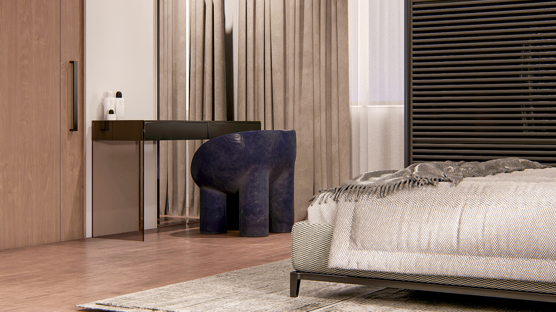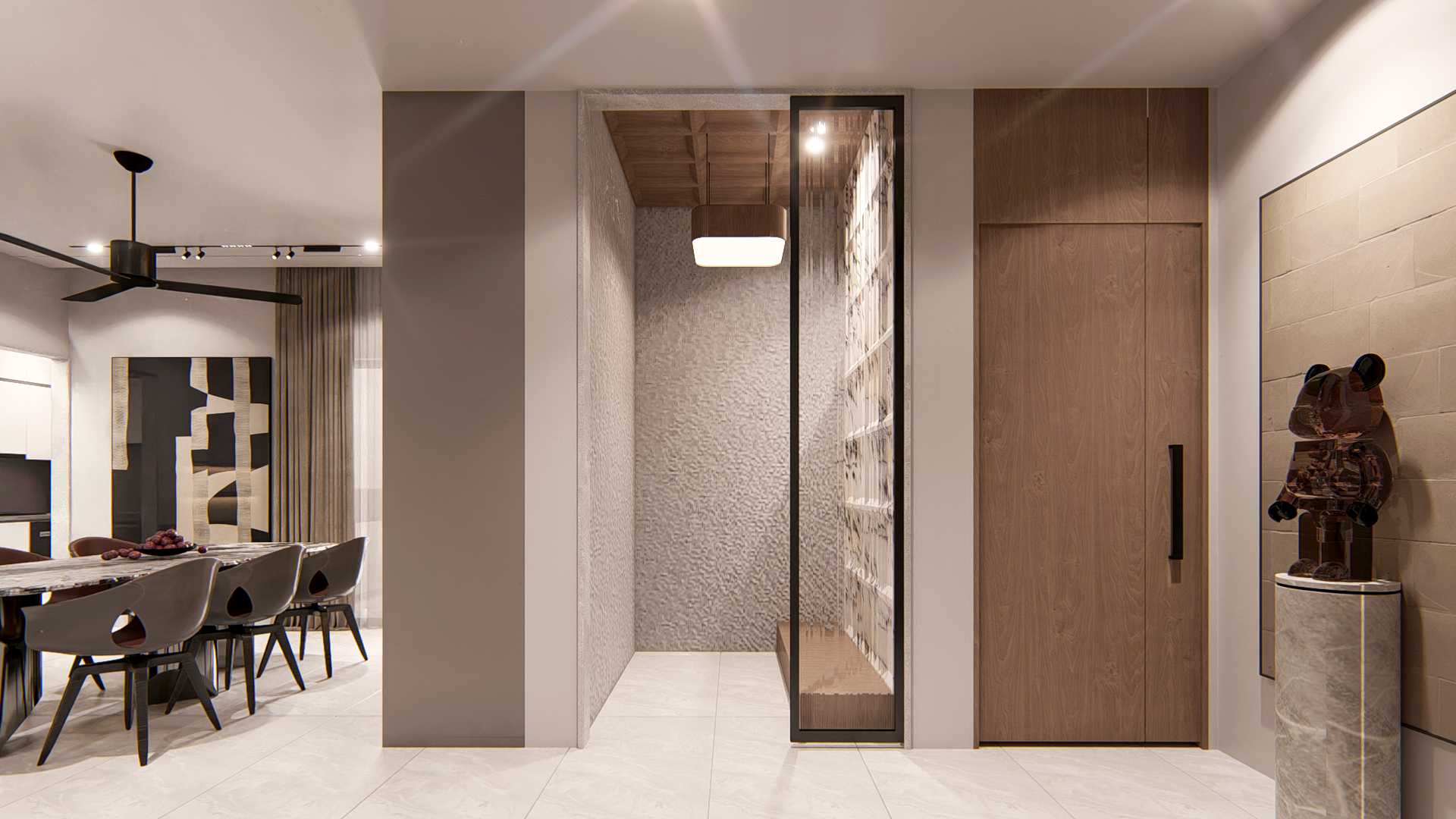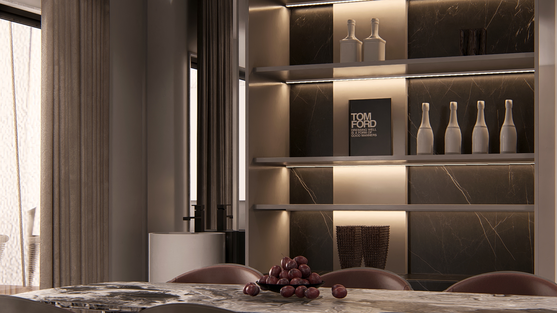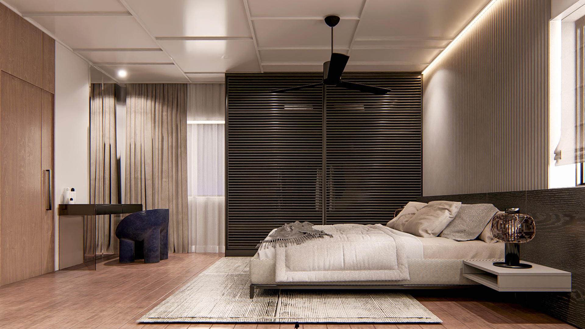 A Contemporary Haven of Luxury & Personal Expression Located on the top floor of a premium luxury apartment with panoramic views of the city, this residence is a sophisticated fusion of modern opulence and thoughtfully curated personal experiences. The material palette embraces pure luxury—a harmonious play of premium finishes, refined textures, and contemporary detailing that elevates everyday living into an immersive design experience. The spatial journey begins with a minimal and graceful foyer that opens into a vibrant, light-filled living hall. A striking Statuario marble platform forms the base of the TV unit, establishing an unmistakable statement of ultra-modern luxury. Every detail is executed with precision, including seamlessly concealed DB boards integrated into the wall paneling—maintaining aesthetic clarity without compromising functionality. The dining area continues the narrative of bold elegance with a beautifully crafted black-tinted glass crockery unit that becomes both a functional centrepiece and a sculptural visual highlight. Adjacent lies the guest bedroom, styled in a Neo-Classical language softened with delicate floral POP elements—merging vintage charm with contemporary refinement. The master bedroom unfolds as a generous sanctuary designed to breathe luxury, comfort, and convenience. Warm textures, layered lighting, and bespoke detailing transform it into a personal retreat that balances sophistication with serenity. Designed with a soft and youthful aesthetic, the daughter’s bedroom reflects tender personalisation. A gentle pink palette paired with playful wavy HDHMR elements shapes a charming space filled with personality and warmth—crafted as a reflection of her identity. The Pooja room serves as a vibrant spiritual core, reinterpreted through a modern lens. Clad in fluted marble with Statuario marble drawers, the space blends traditional sentiment with contemporary elegance, transforming devotion into a beautifully designed spatial experience. Together, the spaces form a cohesive narrative of refined living—where luxury meets meaningful design and where every corner celebrates beauty, purpose, and comfort.