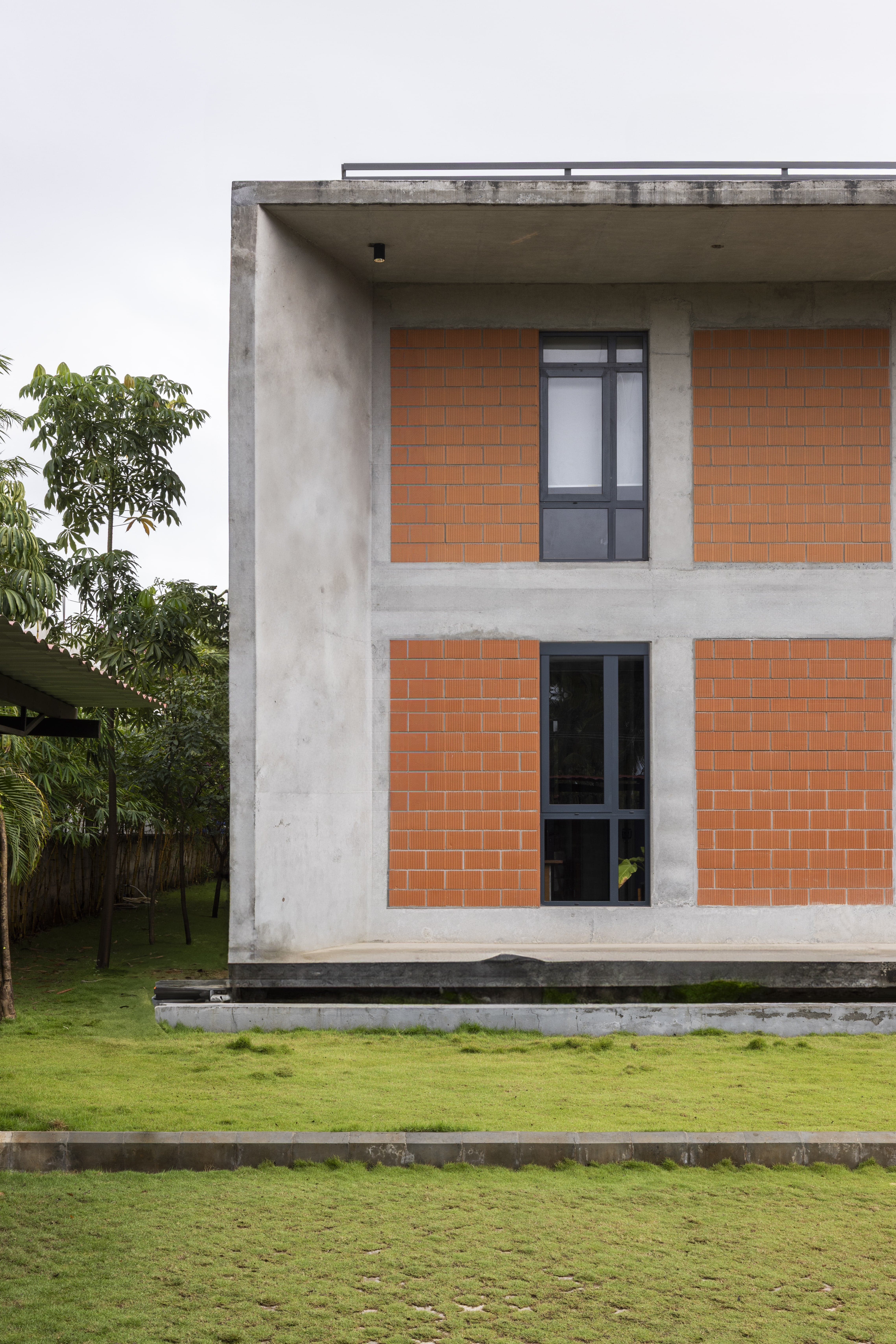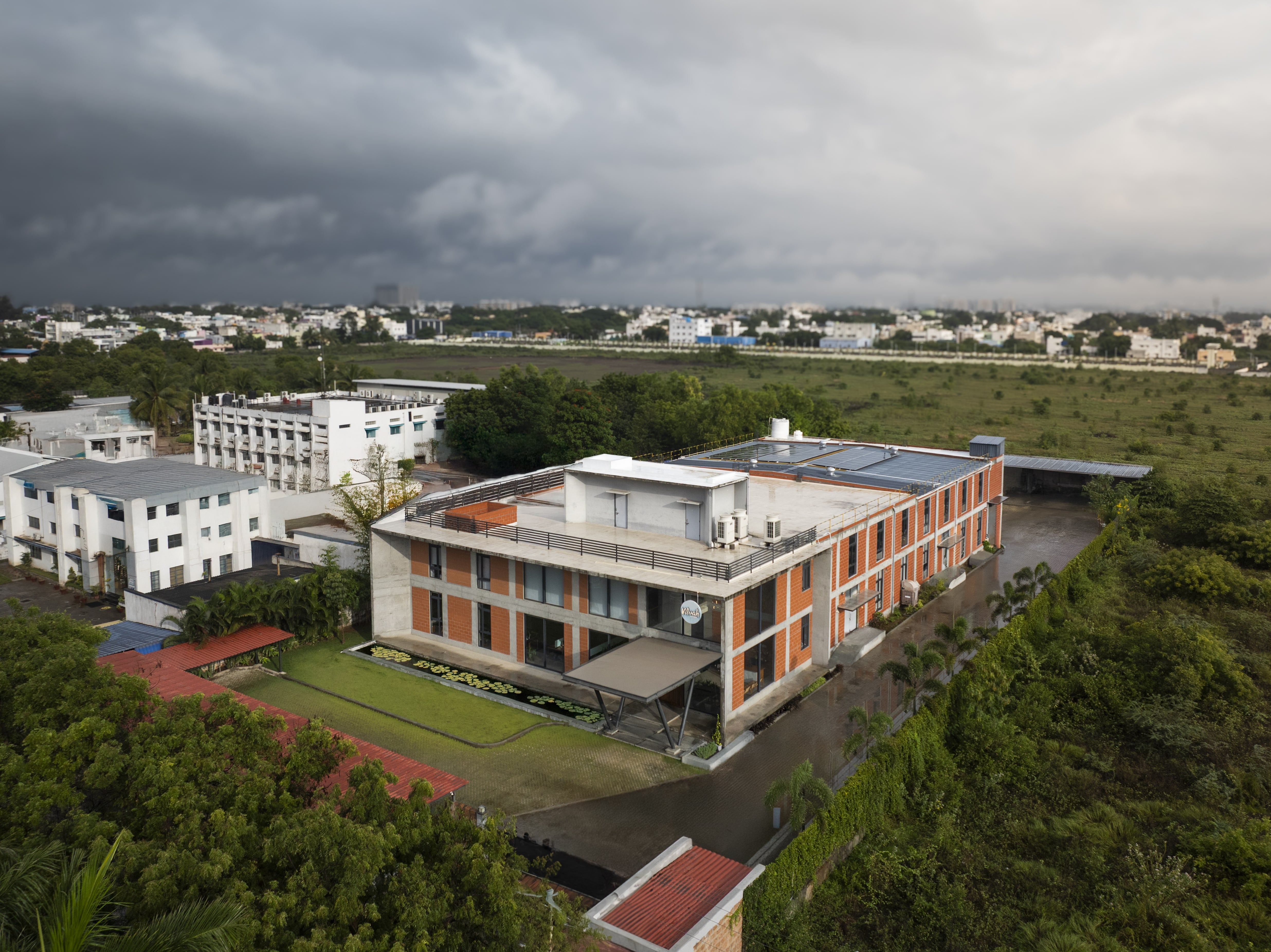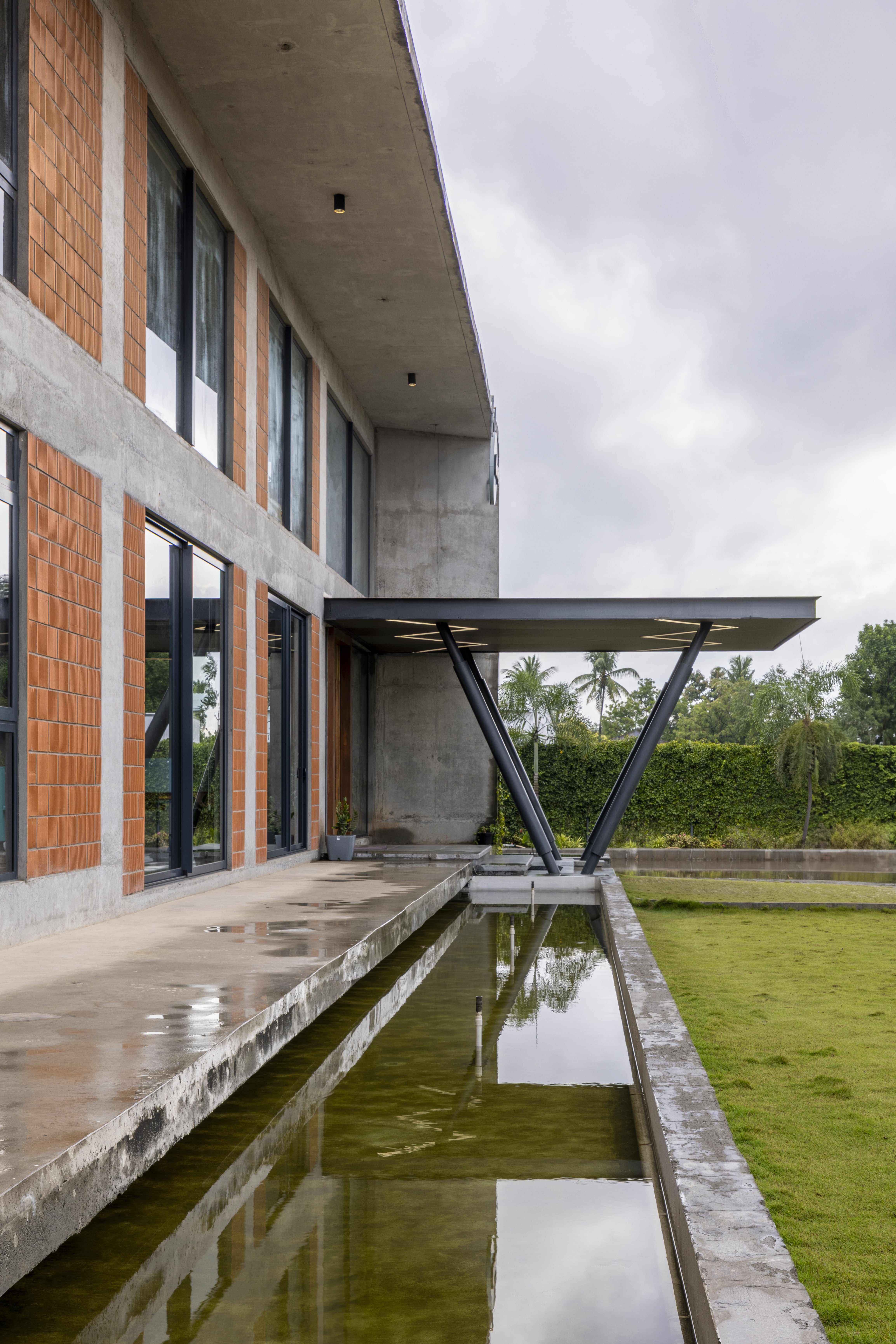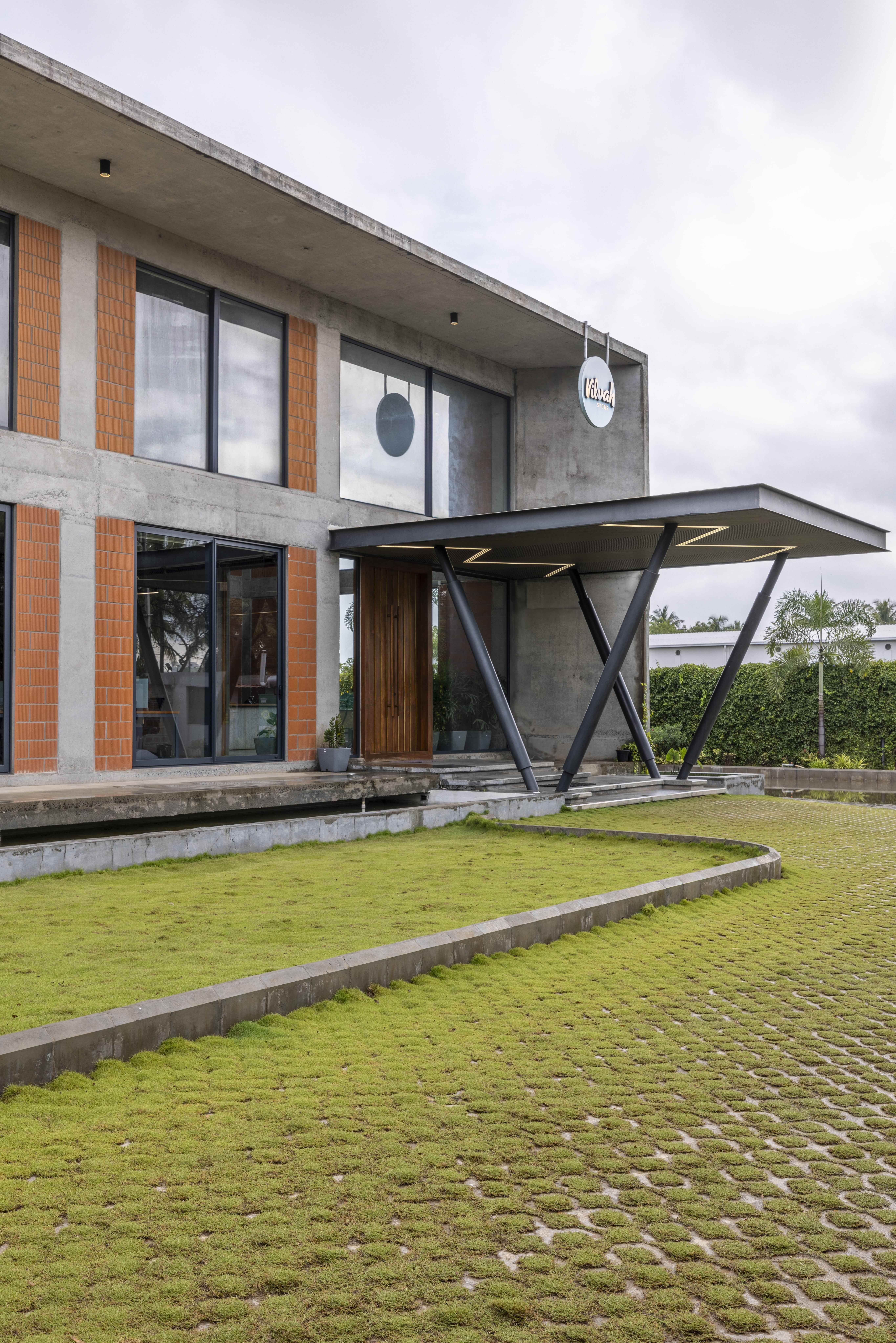 Architecture that embodies sustainability, simplicity, and sensory depth. Vilvah’s Architectural Manifesto: A Sanctuary of Sustainability and Biophilic Harmony Set in the tranquil landscape of Coimbatore, Vilvah’s Headquarters and Manufacturing Facility stands as a poetic architectural translation of the brand’s essence-rooted in sustainability, biophilia, and an unyielding reverence for nature. Spanning 30,000 square feet, the building is envisioned as a living organism, where material honesty, crafted details, and landscape weave together into a calm, nurturing ecosystem. From the moment one approaches the building, the architecture begins its storytelling. The entrance porch, defined by elegant sloped columns, forms a sculptural and welcoming frame. Adjacent to this porch lies a koi fish pond that gently traces its way along the building, introducing movement, reflection, and serenity. The soft ripple of water and presence of koi set a meditative tone, dissolving the heaviness of concrete with a sense of fluidity and life. Stepping inside, the space opens into a double-height reception, where large aluminium-framed windows invite a generous wash of natural light. The atmosphere feels airy and warm, establishing an immediate connection with the outdoors. Anchoring this entrance is the 10-foot teakwood main door, detailed with brass inlays—a celebration of handcrafted elegance, rooted in Indian materiality and timeless design. The architectural palette embraces raw authenticity. Exposed concrete walls, unplastered Porotherm bricks, and vernacular-style wooden furniture create a cohesive, grounded aesthetic that reflects Vilvah’s organic ethos. These material choices are not merely visual; they support sustainability, natural cooling, and reduced embodied energy. The spatial planning follows a simple, intuitive logic. The front section houses the office spaces, designed for openness and easy collaboration. Natural light and greenery are ever-present, softening the otherwise industrial language. At the administrative heart sit two Managing Director cabins, placed symmetrically with a serene internal courtyard between them. This courtyard acts as a contemplative core—filled with plants, filtered sunlight, and an atmosphere of stillness that breaks the monotony of work. It becomes a shared visual pause, a moment of grounding within the building’s daily rhythm. Beyond the office zone, the layout transitions into the manufacturing wing, where functionality and material honesty continue. Exposed ceilings reveal the structural and service networks, reinforcing the brand’s values of transparency and unpretentious design. The manufacturing spaces are organized to support seamless flow from formulation to packaging, without sacrificing comfort or daylight. Throughout the facility, biophilic design remains a central philosophy. Indoor greenery, water elements, tactile materials, and diffused natural light together shape an environment that promotes well-being, mindfulness, and a deeper sense of belonging. Every design decision nods to sustainability—Porotherm bricks enhance thermal comfort; natural lighting reduces energy load; thoughtful ventilation improves airflow; and the site planning supports rainwater management and future renewable integrations. In essence, Vilvah’s headquarters is more than a built structure. It is an architectural manifesto—a harmonious blend of raw textures, natural elements, and eco-conscious design. It represents an evolving future where buildings nurture, inspire, and remain deeply rooted in the earth they rise from. Raw yet refined, grounded yet uplifting, this architectural sanctuary embodies the spirit of Vilvah: honest, organic, and beautifully alive.