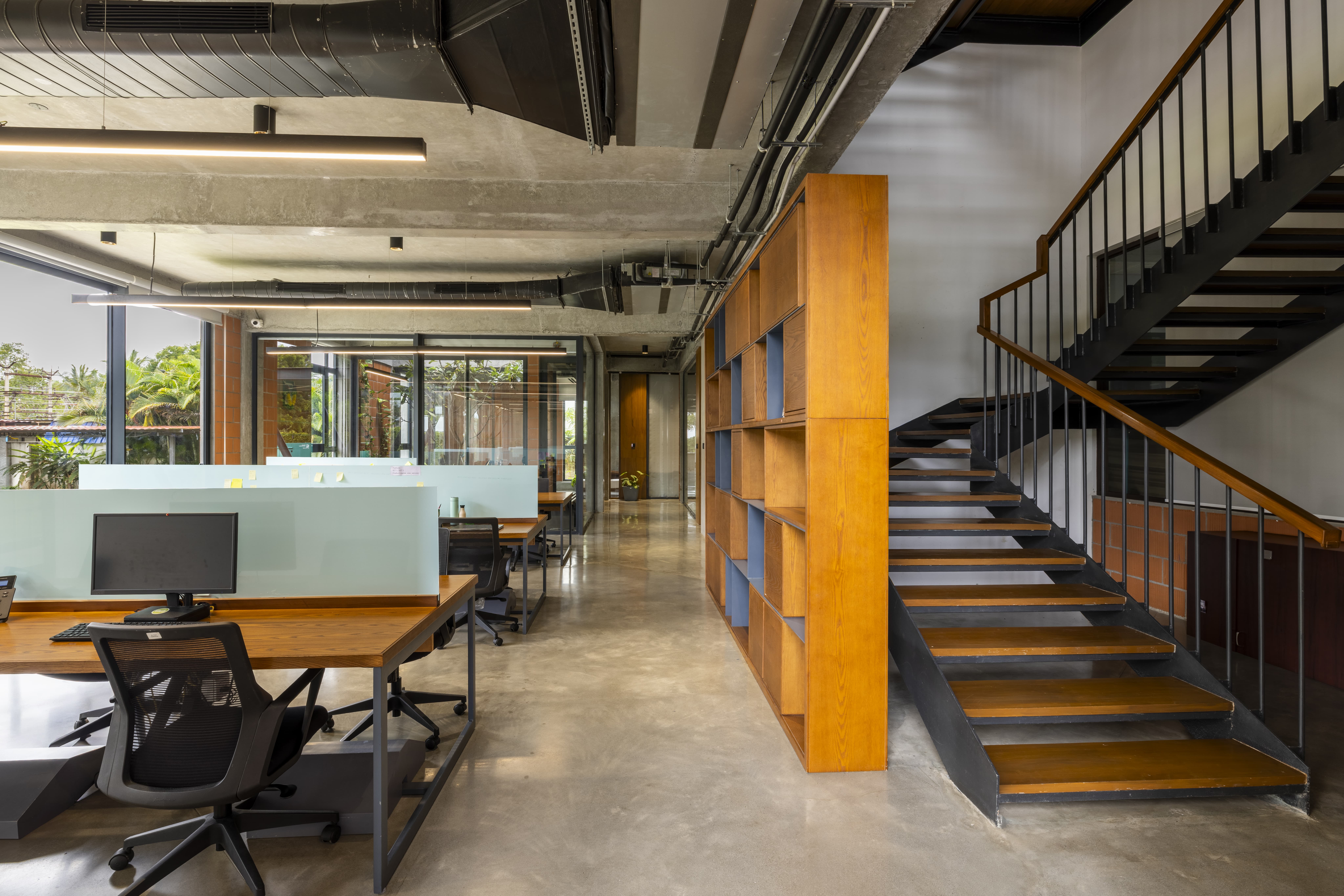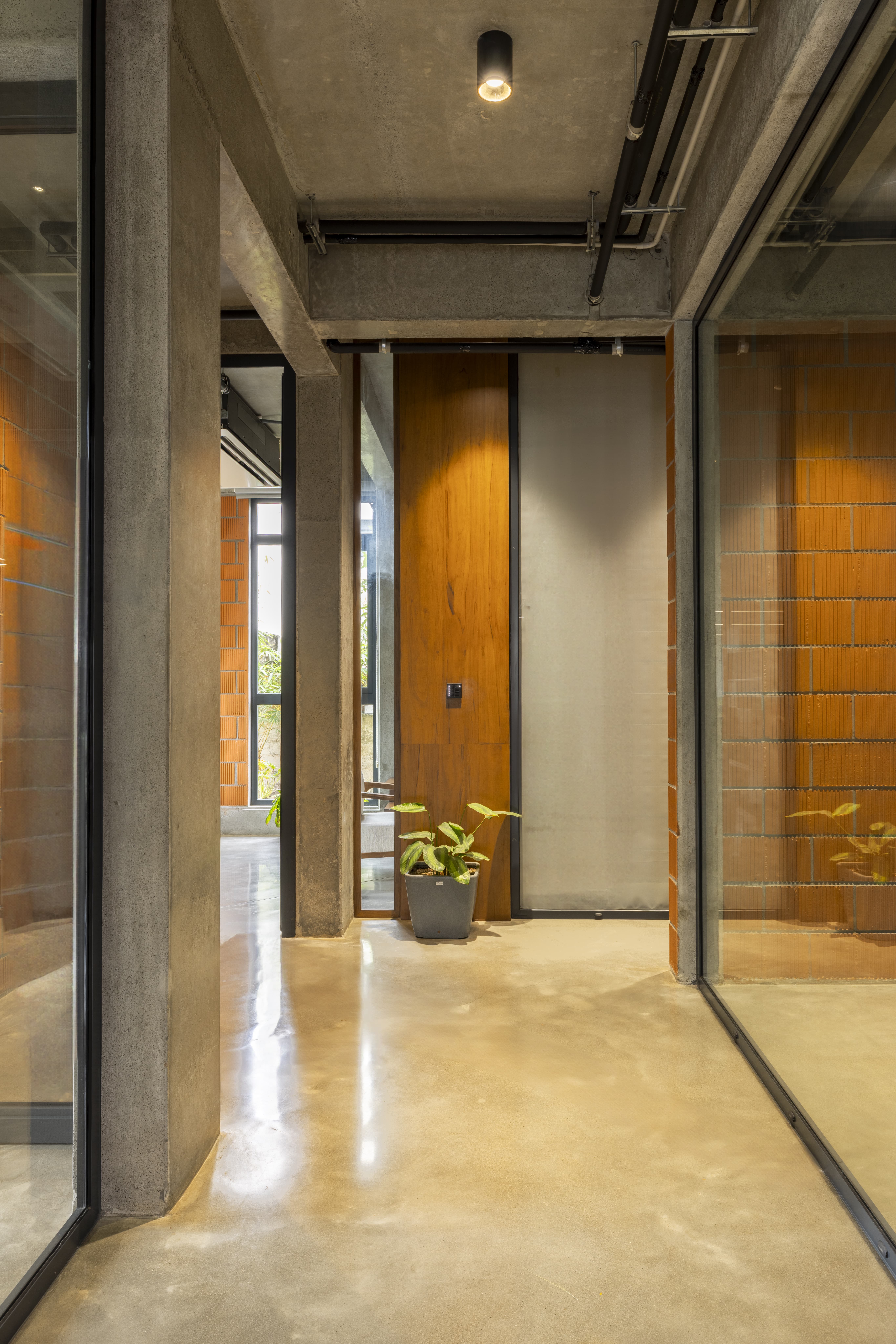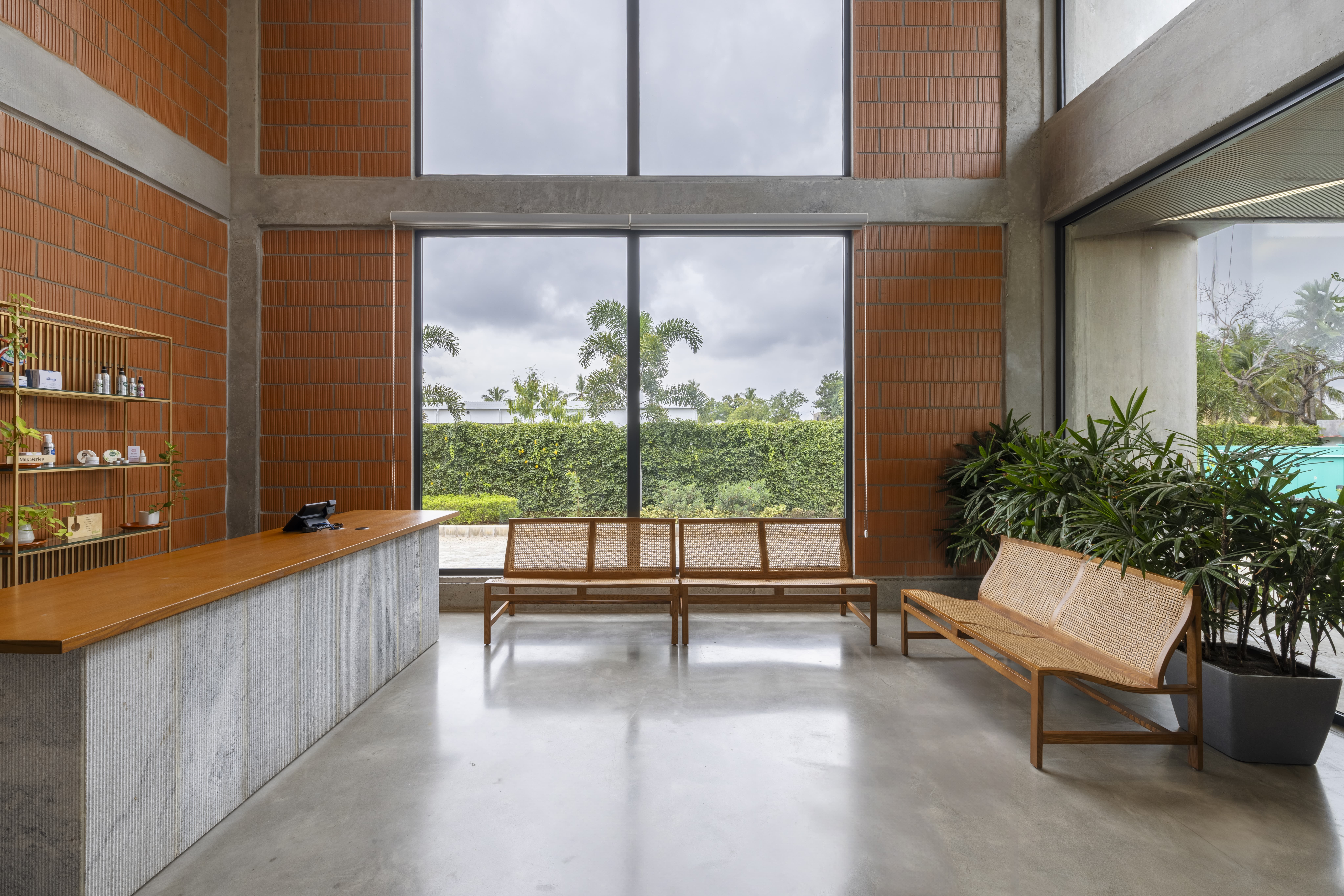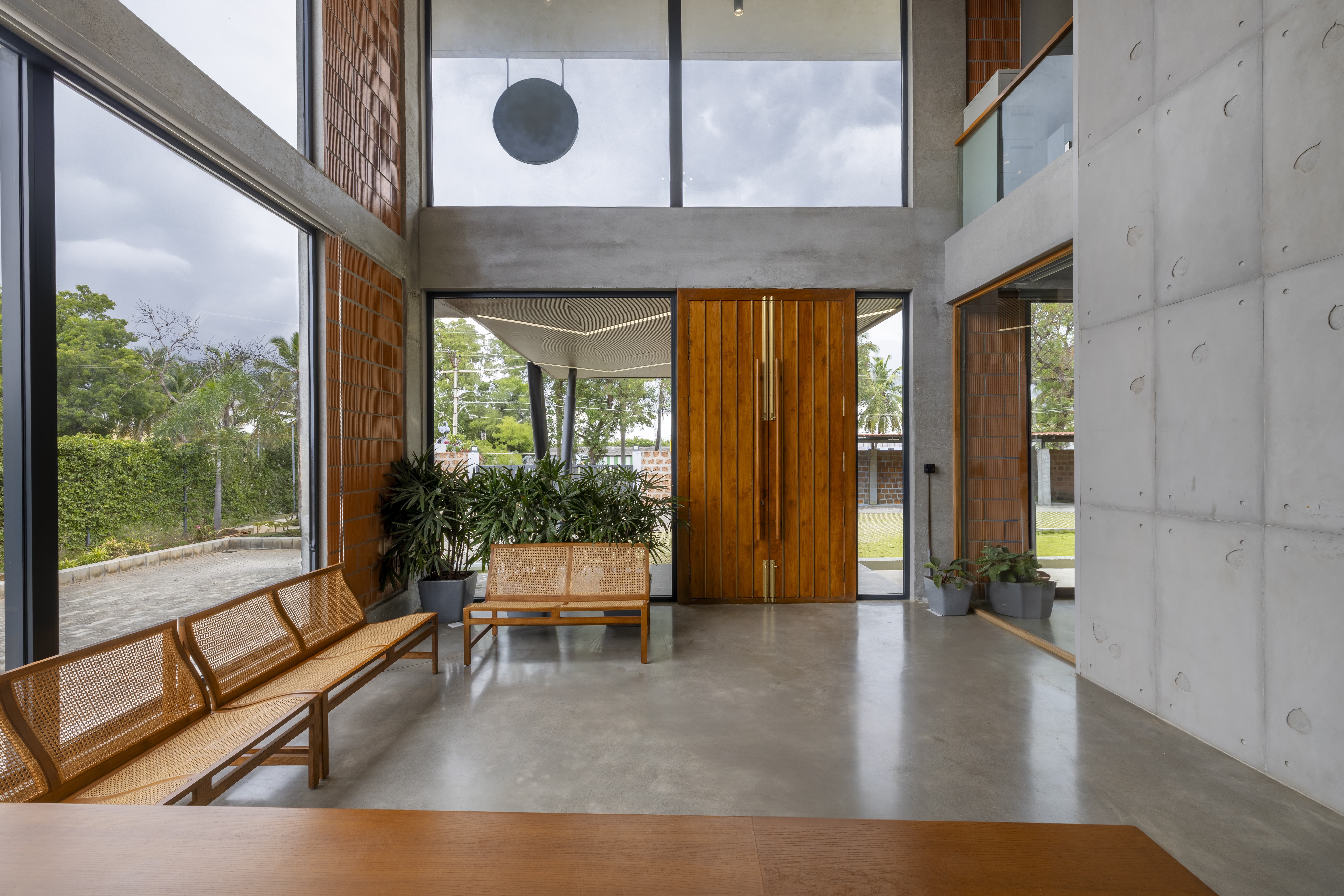 Architecture that embodies sustainability, simplicity, and sensory depth. Vilvah’s Architectural Manifesto: A Sanctuary of Sustainability and Biophilic Harmony Set in the tranquil landscape of Coimbatore, Vilvah’s Headquarters and Manufacturing Facility stands as a poetic architectural translation of the brand’s essence—rooted in sustainability, biophilia, and an unyielding reverence for nature. Spanning 30,000 square feet, the building is envisioned as a living organism, where material honesty, crafted details, and landscape weave together into a calm, nurturing ecosystem. From the moment one approaches the building, the architecture begins its storytelling. The entrance porch, defined by elegant sloped columns, forms a sculptural and welcoming frame. Adjacent to this porch lies a koi fish pond that gently traces its way along the building, introducing movement, reflection, and serenity. The soft ripple of water and presence of koi set a meditative tone, dissolving the heaviness of concrete with a sense of fluidity and life. Stepping inside, the space opens into a double-height reception, where large aluminium-framed windows invite a generous wash of natural light. The atmosphere feels airy and warm, establishing an immediate connection with the outdoors. Anchoring this entrance is the 10-foot teakwood main door, detailed with brass inlays—a celebration of handcrafted elegance, rooted in Indian materiality and timeless design. The architectural palette embraces raw authenticity. Exposed concrete walls, unplastered Porotherm bricks, and vernacular-style wooden furniture create a cohesive, grounded aesthetic that reflects Vilvah’s organic ethos. These material choices are not merely visual; they support sustainability, natural cooling, and reduced embodied energy. The spatial planning follows a simple, intuitive logic. The front section houses the office spaces, designed for openness and easy collaboration. Natural light and greenery are ever-present, softening the otherwise industrial language. At the administrative heart sit two Managing Director cabins, placed symmetrically with a serene internal courtyard between them. This courtyard acts as a contemplative core—filled with plants, filtered sunlight, and an atmosphere of stillness that breaks the monotony of work. It becomes a shared visual pause, a moment of grounding within the building’s daily rhythm. Beyond the office zone, the layout transitions into the manufacturing wing, where functionality and material honesty continue. Exposed ceilings reveal the structural and service networks, reinforcing the brand’s values of transparency and unpretentious design. The manufacturing spaces are organized to support seamless flow from formulation to packaging, without sacrificing comfort or daylight. Throughout the facility, biophilic design remains a central philosophy. Indoor greenery, water elements, tactile materials, and diffused natural light together shape an environment that promotes well-being, mindfulness, and a deeper sense of belonging. Every design decision nods to sustainability—Porotherm bricks enhance thermal comfort; natural lighting reduces energy load; thoughtful ventilation improves airflow; and the site planning supports rainwater management and future renewable integrations. In essence, Vilvah’s headquarters is more than a built structure. It is an architectural manifesto—a harmonious blend of raw textures, natural elements, and eco-conscious design. It represents an evolving future where buildings nurture, inspire, and remain deeply rooted in the earth they rise from. Raw yet refined, grounded yet uplifting, this architectural sanctuary embodies the spirit of Vilvah: honest, organic, and beautifully alive.